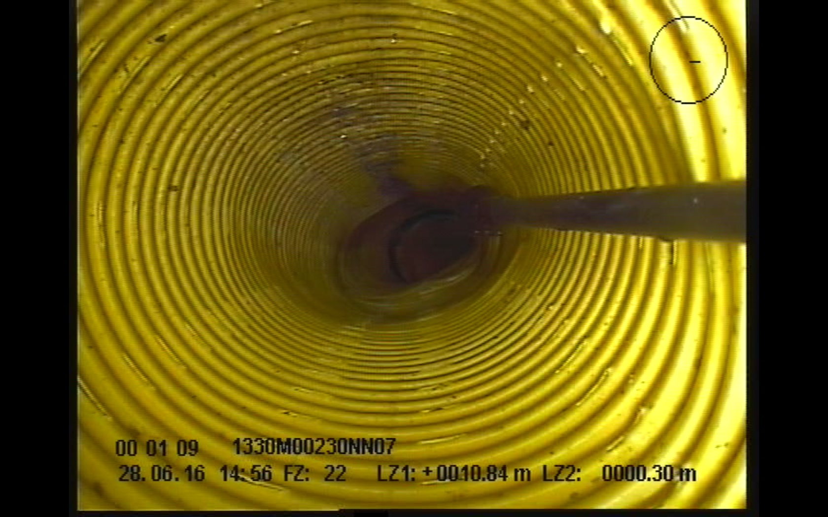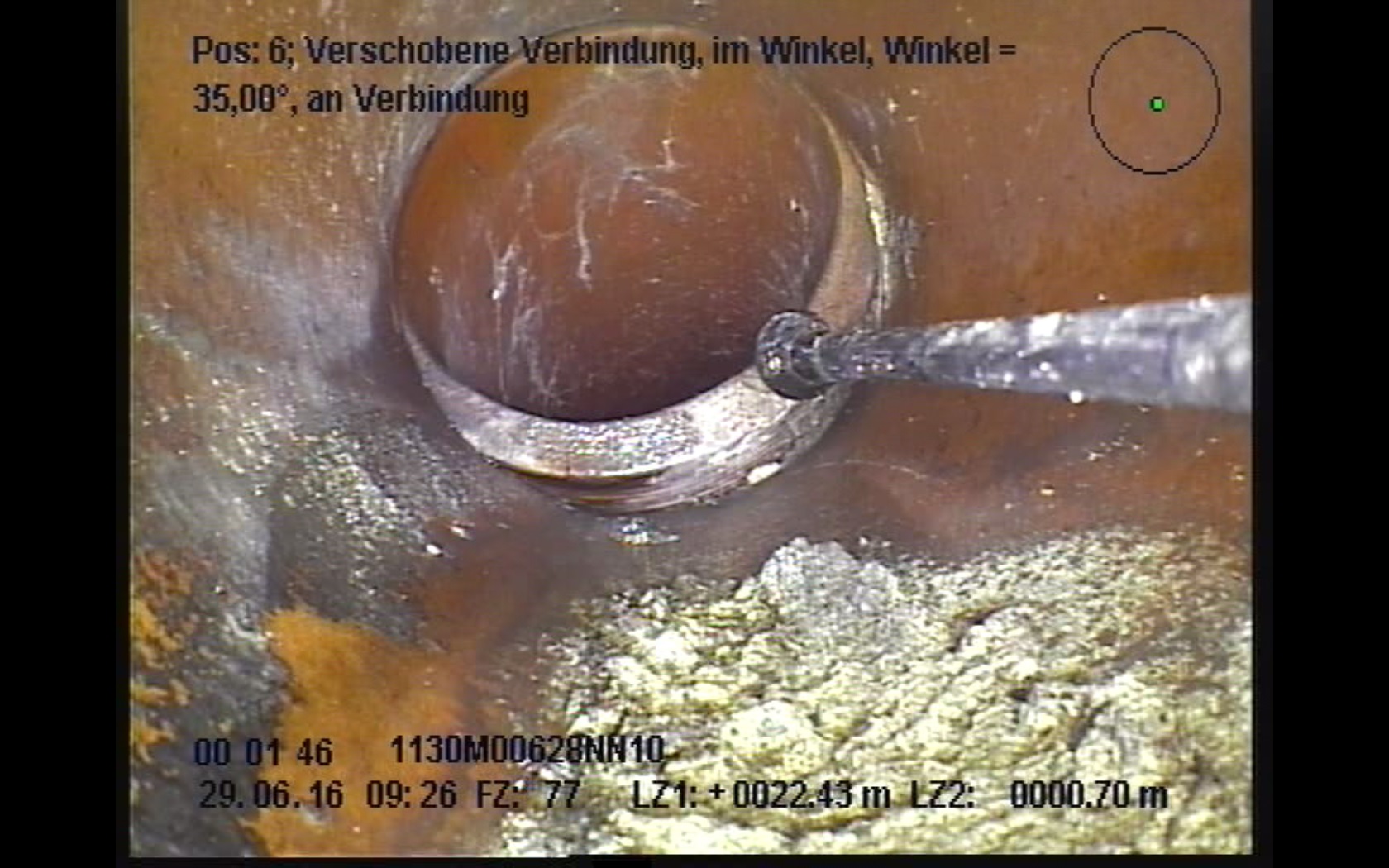 Anhand dieses Praxiseinsatzes zeigt sich ein weiterer Vorteil. Die Verlaufsmessung wurde mit der Kamera ORION L durchgeführt, der lenkbaren Version der Dreh- und Schwenkkopfkamera ORION. Ihre Führungseinheit „Kieler Stäbchen“ ist in alle Richtungen dreh- und schwenkbar und lenkt die Kamera harmonisch in den Zielkanal. Das „Kieler Stäbchen“ bewies in Rodewisch zum wiederholten Mal, dass es nicht nur als Führungseinheit dient, sondern auch als Werkzeug. Die kleine Kugel am Kopf des „Kieler Stäbchen“ hat einen Durchmesser von exakt einem Zentimeter; mittels dieses Referenzmaßes können Muffenversätze exakter bestimmt werden. Überdies konnte das Stäbchen kleine Steine beiseite schieben, die sich in den Hauptkanal verirrt hatten.