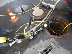 Das Problem des starken Gefälles hätte durch eine Inspektion in Fließrichtung umgangen werden können. Eine Verlaufsmessung in Fließrichtung ist jedoch ungünstig. Ein Abbiegen in die Hausanschlussleitungen ist bei dieser Untersuchungsmethode schwer bis unmöglich. Daher blieb nach einigen Überlegungen doch nur eine Variante: die Inspektion gegen Fließrichtung mit Überwindung des starken Gefälles.