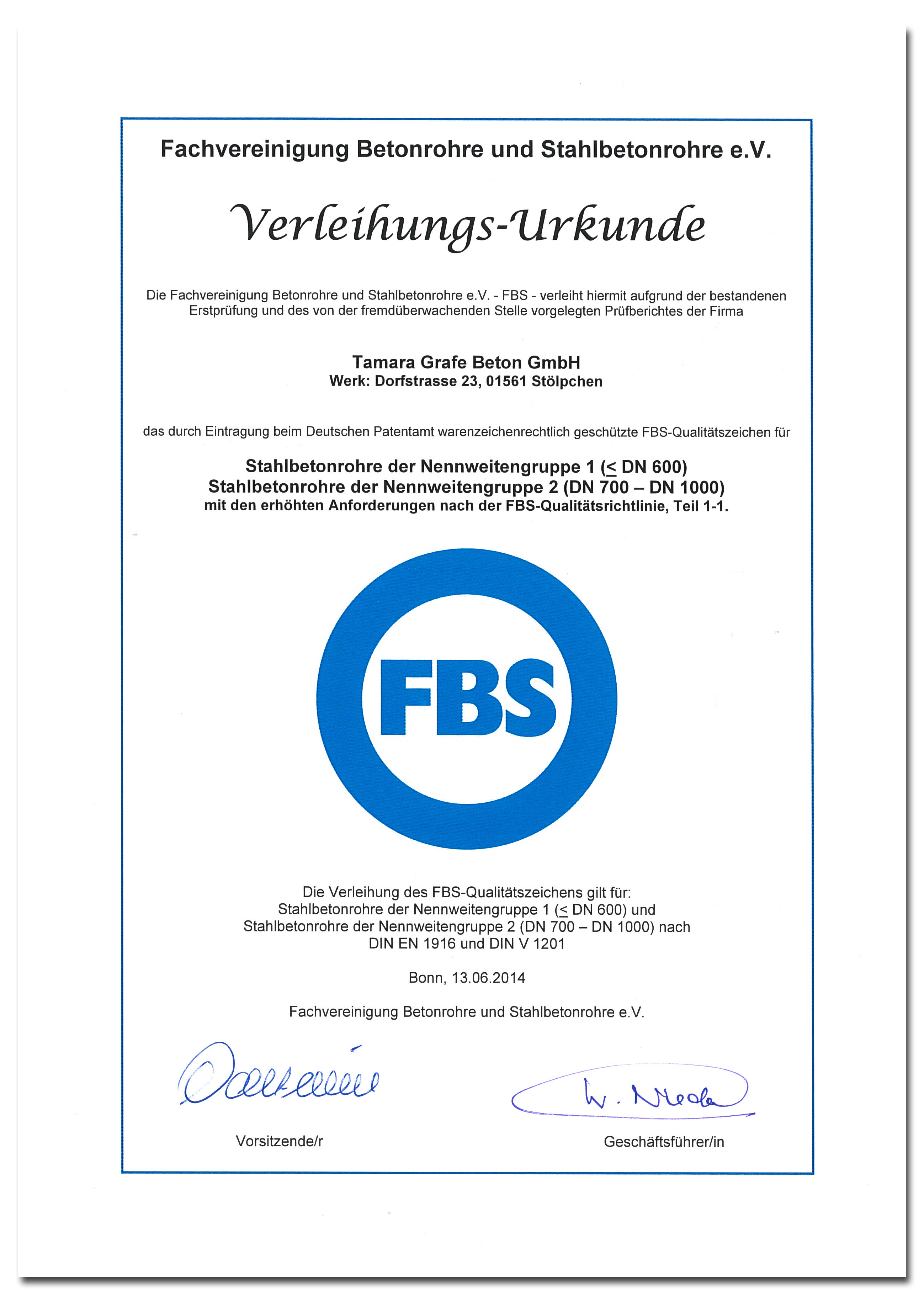 Seit dem 1. Mai 2014 ist die Fachvereinigung Betonrohre und Stahlbetonrohre (FBS) e.V. um ein weiteres Mitglied gewachsen. Dem Zusammenschluss führender Hersteller von Beton-, Stahlbetonrohren und Schachtbauteilen aus Beton und Stahlbeton für die Kanalisation schloss sich das Unternehmen Tamara Grafe Beton aus dem sächsischen Schönfeld an. Das seit über 110 Jahren existierende Unternehmen ist damit das 25. FBS-Mitglied in Deutschland, das Rohre und Schächte in FBS-Qualität produziert.