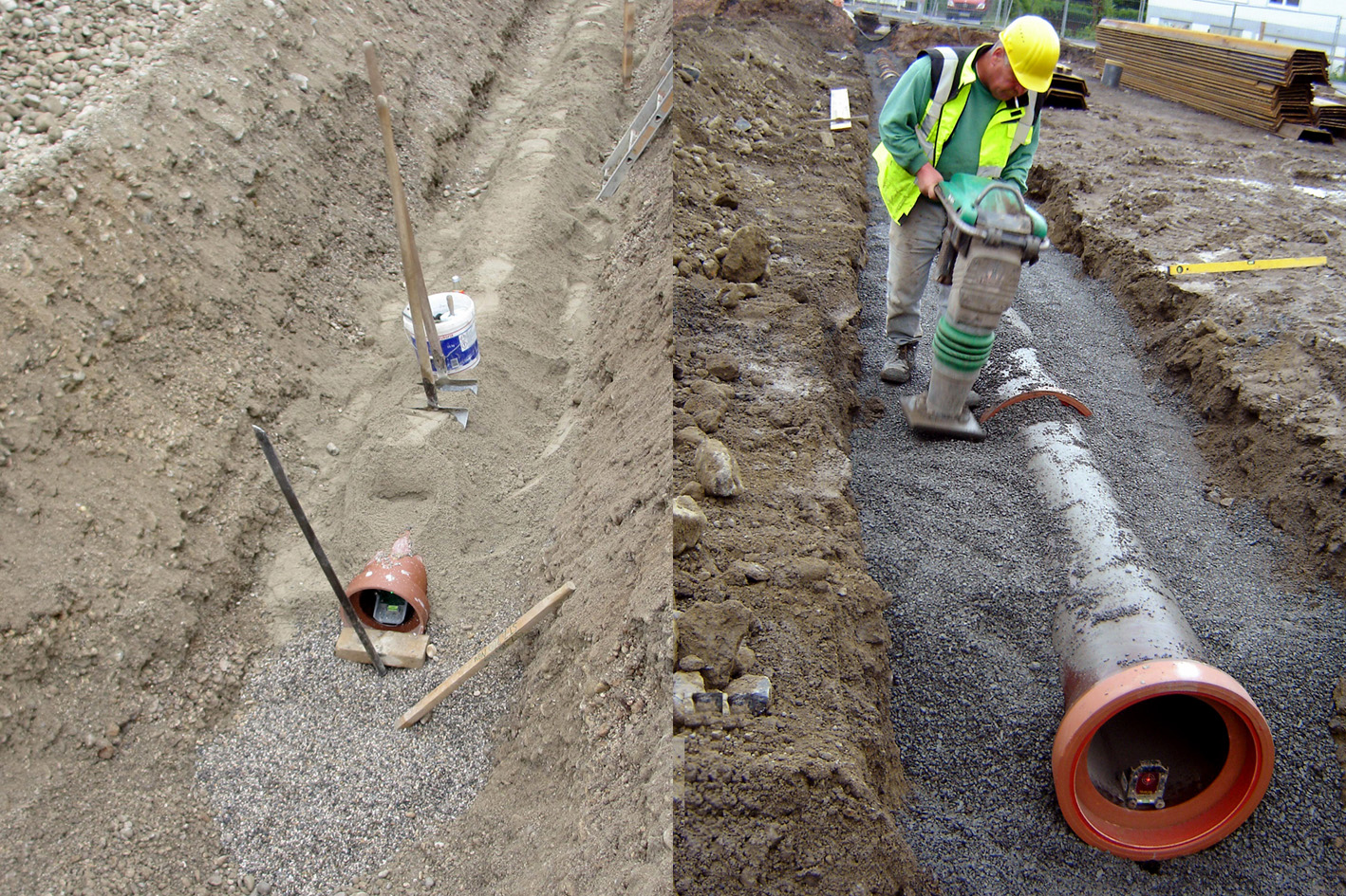 Baustellenbesuche zeigen jedoch, dass bezüglich des verwendeten Materials diese Hinweise und Festlegungen nicht immer berücksichtigt werden. So lässt die DIN EN 1610:2015-12 „Einbau und Prüfung von Abwasserleitungen und -kanälen“ unter Punkt 5.2.1 „Baustoffe für die Leitungszone / Allgemeines“ die Verwendung von anstehendem Boden ausdrücklich zu, wenn die in „5.2.2 „Anstehender Boden“ der Norm getroffenen Festlegungen eingehalten werden. Dabei muss die Verwendung durch die „Ausführungsbestimmungen/Planung“ erlaubt sein und den „Verdichtungsanforderungen“ entsprechen.