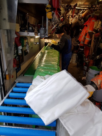 Besondere Herausforderung waren hierbei die beiden 45 Grad Bögen am Inversions-Anfang sowie die relativ kühle Umgebungstemperatur von nur drei Grad Celsius. Das Harz wurde daher im temperierten Fahrzeug verarbeitet und der Liner damit imprägniert.