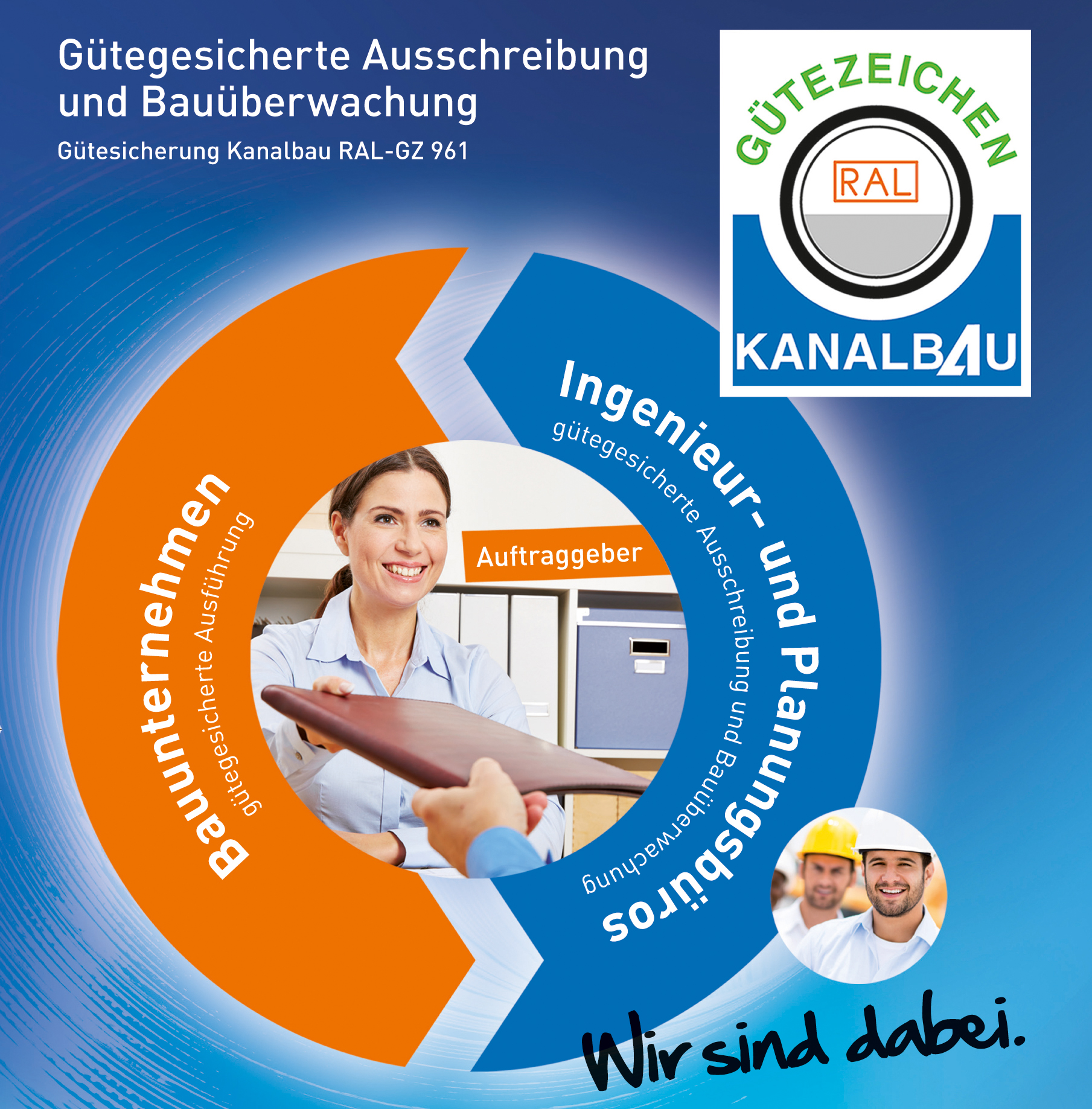 Genau dieses Ziel verfolgt die RAL-Gütegemeinschaft entsprechend dem Auftrag ihrer Mitgliederversammlung. Dieser Auftrag wurde mit paritätischen Stimmen von Auftraggeber, Ingenieurbüros und ausführenden Unternehmen gefasst. Die RAL-Gütesicherung bietet Auftraggebern eine Möglichkeit, fachlich geeignete Unternehmen und Ingenieurbüros für ihre Maßnahmen auszuwählen. In den Güte- und Prüfbestimmungen RAL-GZ 961 sind dazu gemeinsam definierte Anforderungen an die Fachkunde, technische Leistungsfähigkeit und technische Zuverlässigkeit der ausführenden Unternehmen und der Ingenieurbüros beschrieben. Ingenieurbüros und Auftraggeber selbst belegen im Bereich Ausschreibung (A) und Bauüberwachung (B) über das Gütezeichen Kanalbau die notwendige Erfahrung und Qualifikation getrennt für den offenen Kanalbau (Gruppe ABAK), für den grabenlosen Einbau (Gruppe ABV) und für die grabenlose Sanierung (Gruppe ABS).