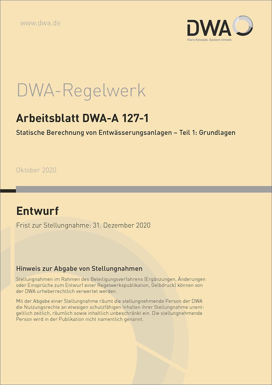 Der Entwurf des Arbeitskblatts DWA-A 127-1 Statische Berechnung von Entwässerungsanlagen – Teil 1: Grundlagen gilt für die statische Berechnung von Entwässerungsanlagen und gibt eine allgemeine Einführung in die Statik und deren Grundlagen. Erläuterungen zum Sicherheitsniveau und zum Prozessablauf sind ebenfalls enthalten.