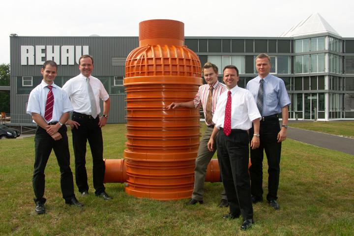 Der erste Platz, und damit 5000 Euro, ging an Eric Bobay, Marius Ciolak, Tobias Heger, Roland Hendel, Guido Kania und Heiko Leihbecher. Die Entwickler überzeugten die Jury mit einem polymeren Abwasserschacht. Das System, bezeichnet als "AWASCHACHT DN 1000", ist der erste Schacht seiner Klasse aus dem Werkstoff Polypropylen mit einem Durchmesser von einem Meter. Mit 62 Kilogramm ist er zwar das bisher größte und schwerste Spritzgussteil von REHAU, im Vergleich zu einem herkömmlichen Betonschacht jedoch überaus handlich.