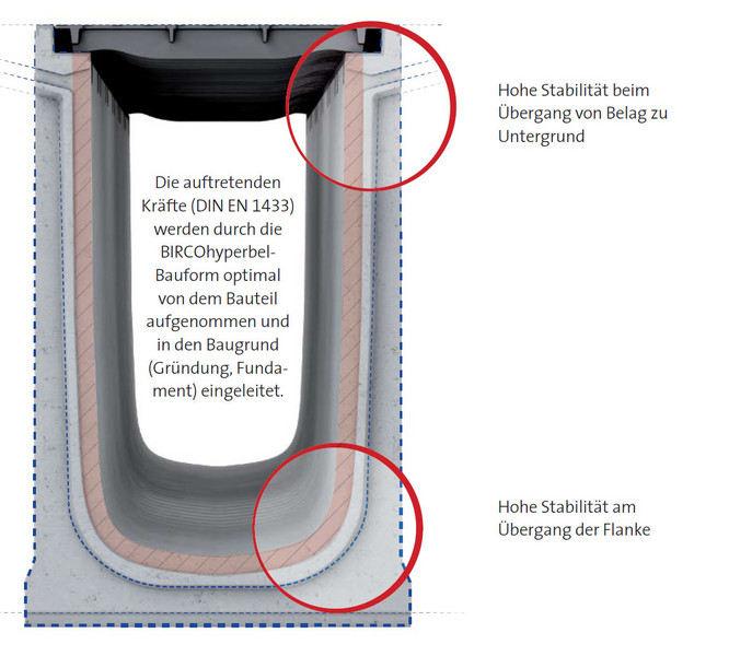 Die BIRCOmax-i ist in den Nennweiten 220, 320, 420 und 520 sowie diversen Bauhöhen erhältlich. Die innovative Bauform BIRCOhyperbel nimmt die an den Flanken vertikal einwirkenden Kräfte auf und leitet sie in das Bauteil ab. Das neue System hält dank des maximalen Rückhalteraums nahe der Oberfläche und der enormen Stabilität jeglichen Anforderungen stand, egal ob im Städtebau oder im Logistikumfeld.