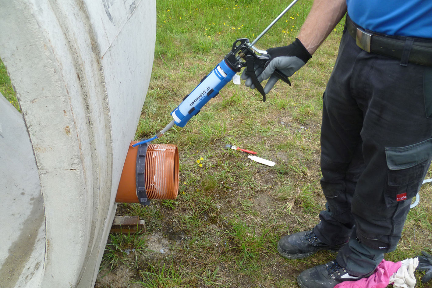 Nach dem Einsetzen des U3-Anschlusses in die Bohröffnung und dem Festziehen mit einem Gewinderad wird abschließend eine Funke 1 K-Dichtmasse in das Bauteil gepresst. Das sorgt zusätzlich für einen festen Sitz und dauerhafte Dichtheit.