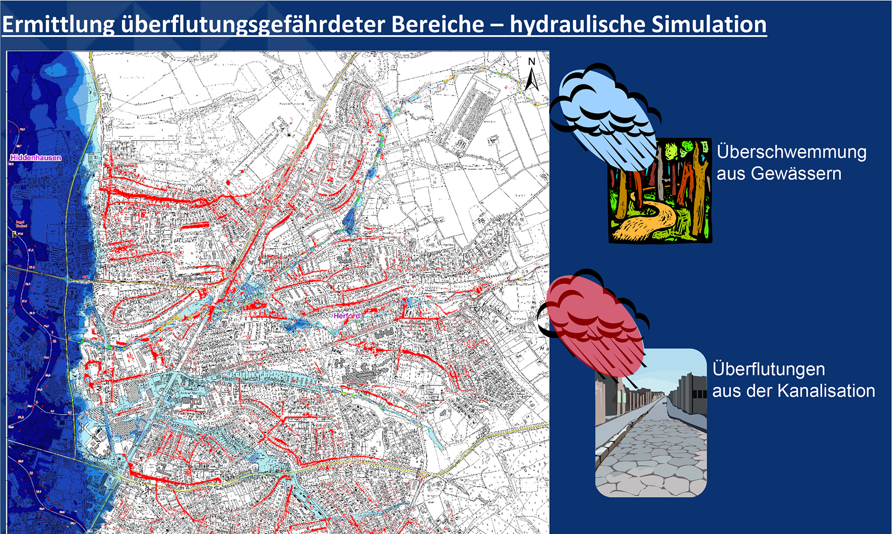 "Wir haben uns die Arbeit gemacht und alle Daten für eine rechnergestützte Überflutungsanalyse ermittelt", berichtete Gerhard Altemeier, technischer Betriebsleiter des Immobilien- und Abwasserbetriebes der Stadt Herford. "Darüber sind wir sehr glücklich", so Altemeier weiter, " denn nun wissen wir ganz genau, auf welche Gebiete und Gebäude wir uns konzentrieren müssen". Der Aufwand sei in der Tat groß und viele Ortsbegehungen notwendig gewesen, um jede Mauer und jeden Bordstein in die Berechnung mit einfließen zu lassen.