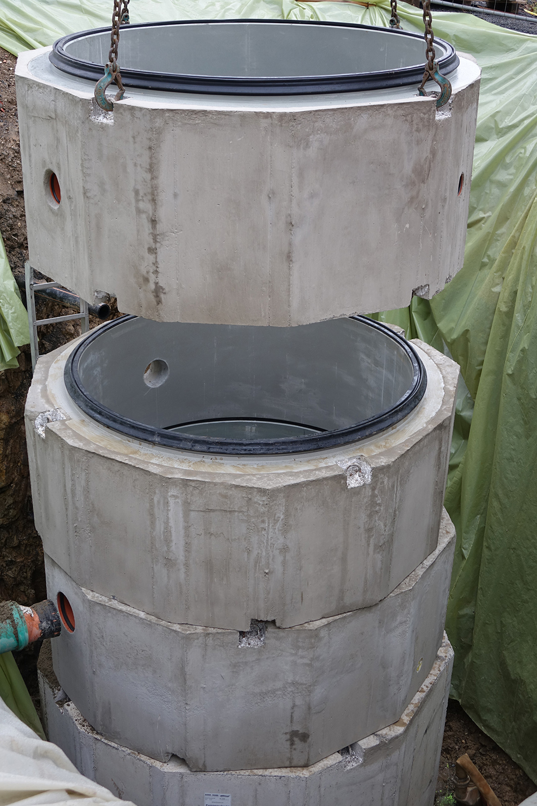 Der kreisrunde FABEKUN-Schacht sollte komplett vorgefertigt werden und über sämtliche Öffnungen für die Einbindung der PP-Abwasserleitung DN 250, Belüftungs- und Entlüftungsleitungen - ebenfalls aus PP - jeweils mit DN 150 sowie der Druckleitung DN 100 und der drei Kabelleerrohre mit jeweils einem Außendurchmesser DA 110 verfügen.