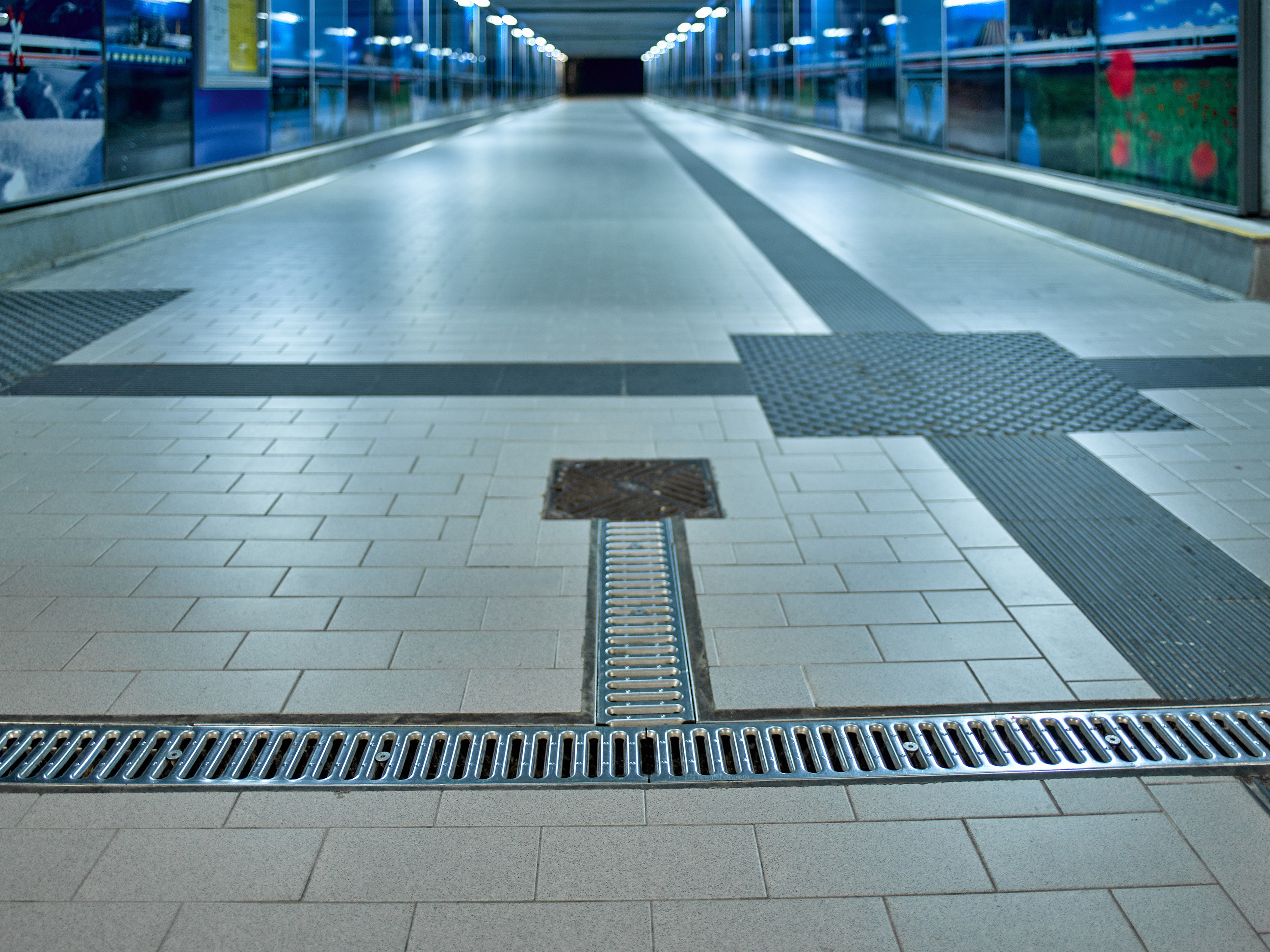 Ziel war es, das austretende Wasser in geordnete Bahnen abzuleiten, dabei den Fußweg im Tunnel nutzbar zu lassen. Wie musste die hierzu erforderliche Rinne konstruiert sein? Und wie sollte das Rinnensystem aussehen? Hauraton kam als Entwässerungstechnologe für die Herausforderung an Bord: Nur circa 100 x 100 mm standen als Maß inklusive Einbau zur Verfügung, also waren eine Abdeckung mit sehr flacher Rinne und eine schmale Rinnenwandung erforderlich.