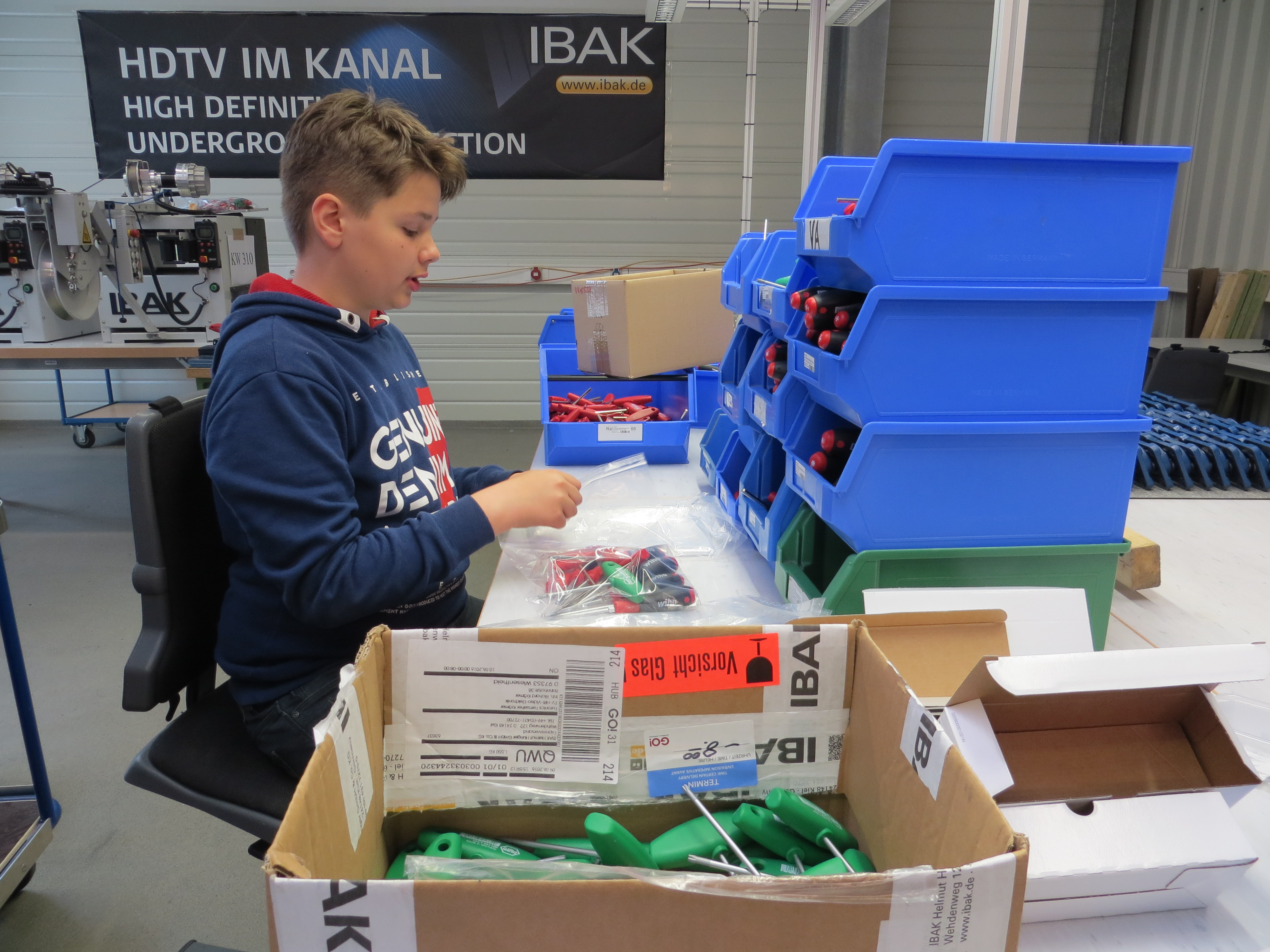 Lars (13 Jahre) und Justin (14 Jahre) vom Gymnasium Elmschenhagen verbrachten ihren Sozialen Tag bei IBAK. Bereits um 7.30 begann ihr Arbeitstag. Die Entscheidung ihre Arbeit bei IBAK auszuüben fiel ihnen nicht schwer, denn sowohl Lars Vater als auch Justins Mutter arbeiten in dem familiengeführten Unternehmen.