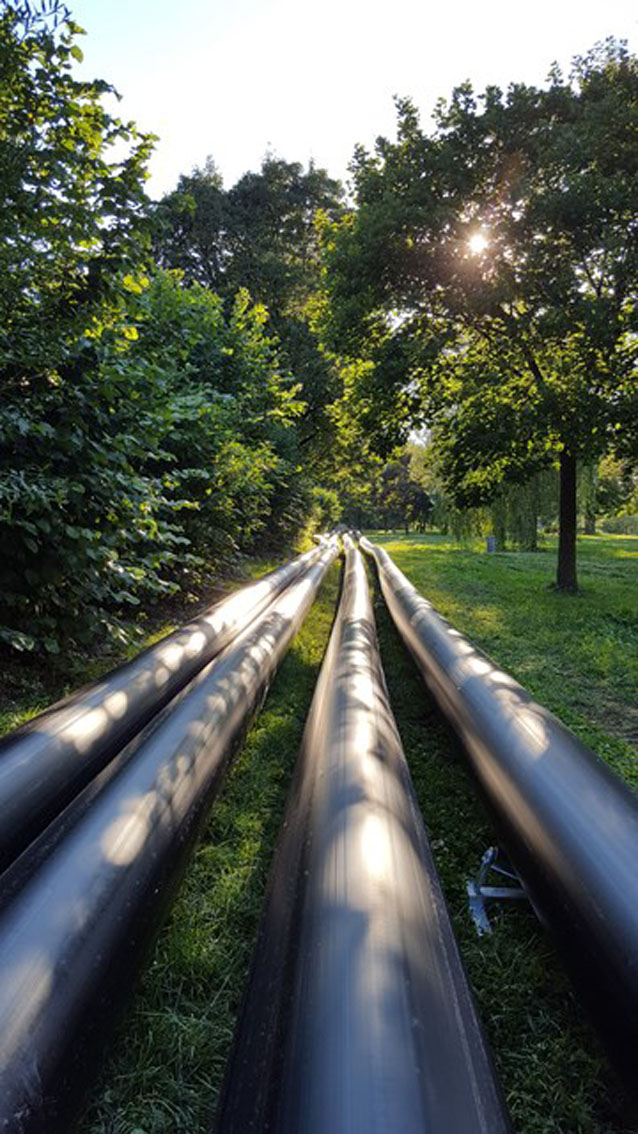 Eine weitere Herausforderung auf dieser Baustelle ist die Aufrechterhaltung des Kanalbetriebs. Zu diesem Zweck wird eine provisorische Druckrohrleitung installiert. Dafür verschweißt das Baustellenteam von AGRU gelieferte PE-Rohre (da 225 mm, SDR 26) zu einer 1800 m langen, oberirdischen PE-Rohrleitung. Sie leitet das Abwasser von jeweils drei Einzugslängen während der Arbeiten ab und wird nach der Sanierung dieser Abschnitte umgesetzt.