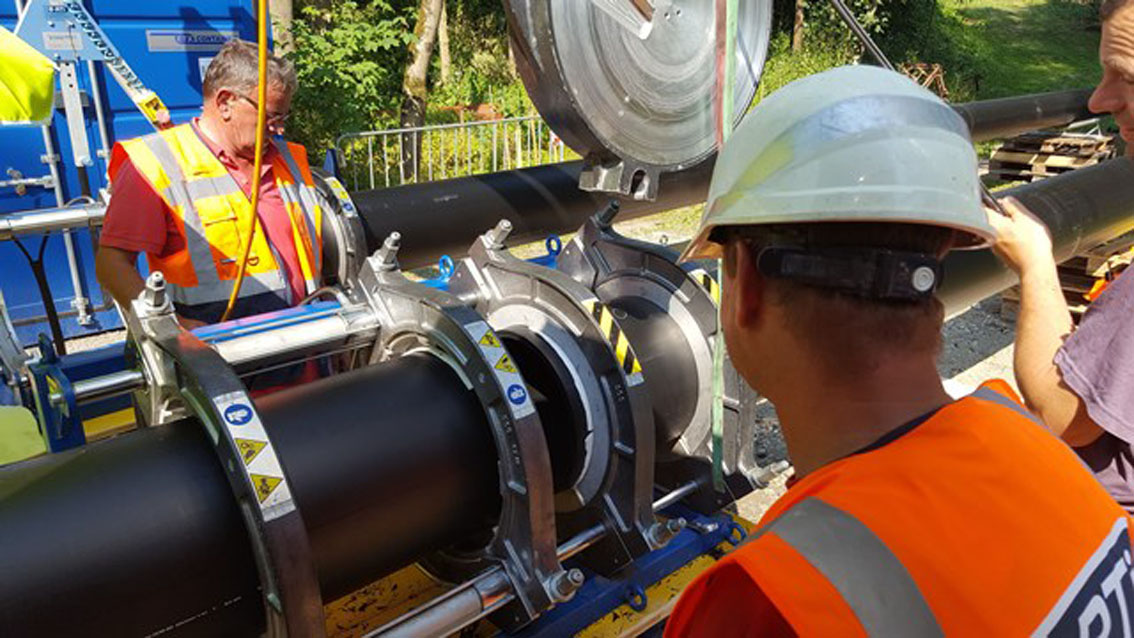 Mittels Heizelementstumpfschweißung werden auf der Baustelle die von AGRU gelieferten, 18 m langen Close-Fit Liner-Rohrstangen (da 400 mm, SDR 26) zu Rohrsträngen zwischen 440 m und 624 m Länge verbunden. Das entspricht den in der Ausschreibung geforderten Einzugslängen. Normalerweise liefert AGRU den Close-Fit Liner, auf Trommeln gewickelt, fertig gefaltet zur Baustelle.