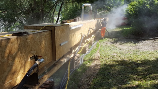 Zum Einzug des U-förmigen Neurohrstranges nutzt RTi die hohe Flexibilität des AGRU Close-Fit Liners, der selbst engste Biegeradien ermöglicht. Mittels des am Rohrstrang angeschweißten Zugkopfes bringt eine Seilwinde die einzelnen Rohrstränge in die gesäuberten Kanalabschnitte ein. Anschließend setzt RTi jeden Rohrstrang mit 120 °C heißem Wasserdampf unter Druck.