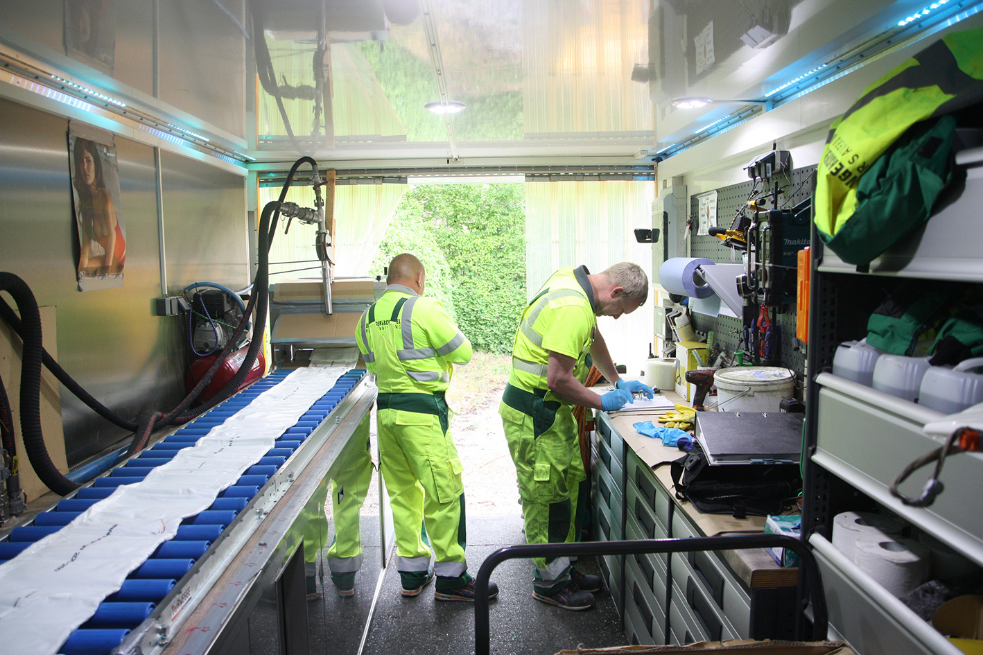 Dieser wird bei der D&S Rohrsanierung erst an der Einbaustelle in einer mit Heizung, Kalibrierwalzen und Zwangsmischanlage ausgerüsteten mobilen Tränkfabrik auf den Einbau vorbereitet. Deren Komponenten sind optimal auf das Verfahren abgestimmt: „Die SPS-gesteuerte, vollautomatische Mischanlage arbeitet als geschlossenes System. Harz- und Härtertank verfügen über ein Volumen von rund 800 kg“, so Dümler weiter.