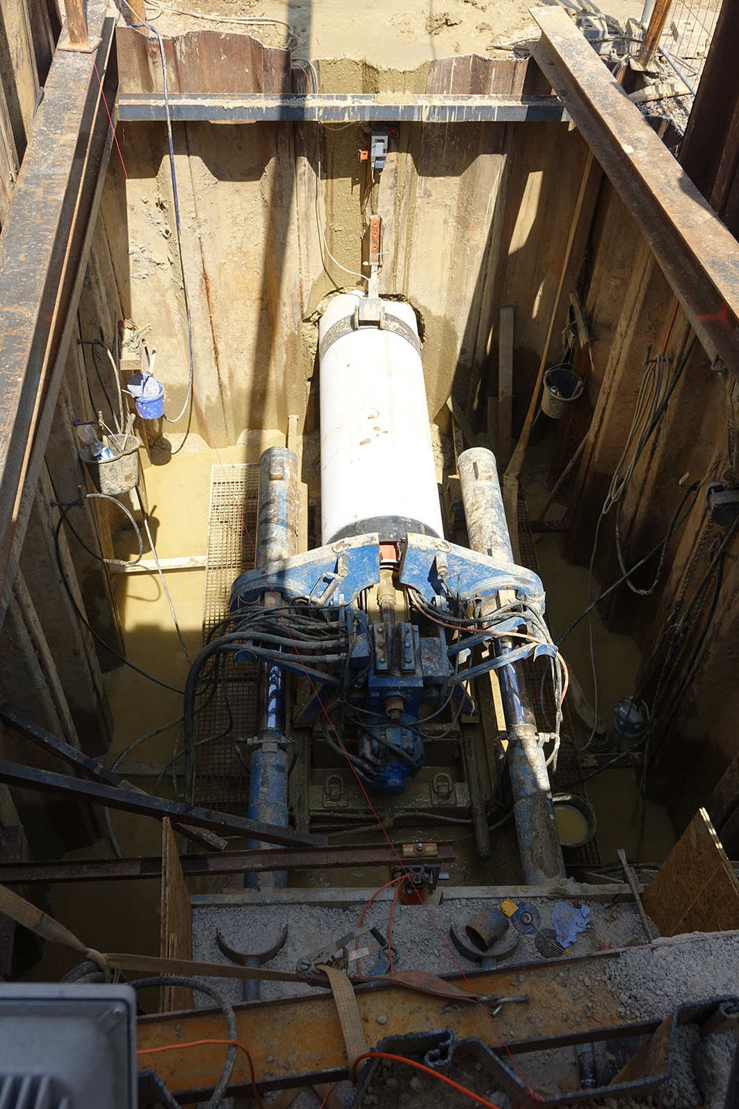 Vortrieb wie geschmiert Bei dem eingesetzten Mikrotunnelbauverfahren handelt es sich um ein steuerbares Verfahren mit Schneckenförderung, d. h. der Bohrkopf der Vortriebsmaschine wird von dem Steuerstand aus in der Linienführung gelenkt. So kann Abweichungen in der horizontalen oder vertikalen Richtung jederzeit entgegengewirkt und die Zielbaugrube treffsicher erreicht werden.