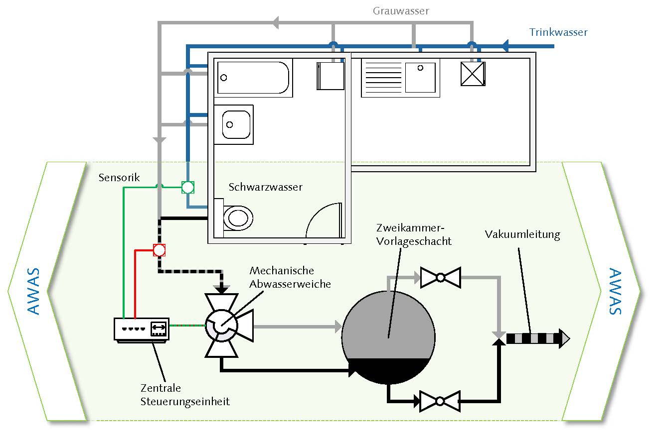 Die Abwasserweiche soll nah am Ort des Abwasseranfalls eingesetzt werden. An den Eintragsstellen, z.B. Toilette, Waschmaschine, Geschirrspülmaschine etc., wird entsprechende Sensorik die Trennung der Abwässer anhand des Zeitpunkts ihrer Einleitung ermöglichen. In einer Vakuumleitung werden die Abwasserteilströme zeitlich getrennt aus dem Zwei-Kammer-Schacht abgeleitet.