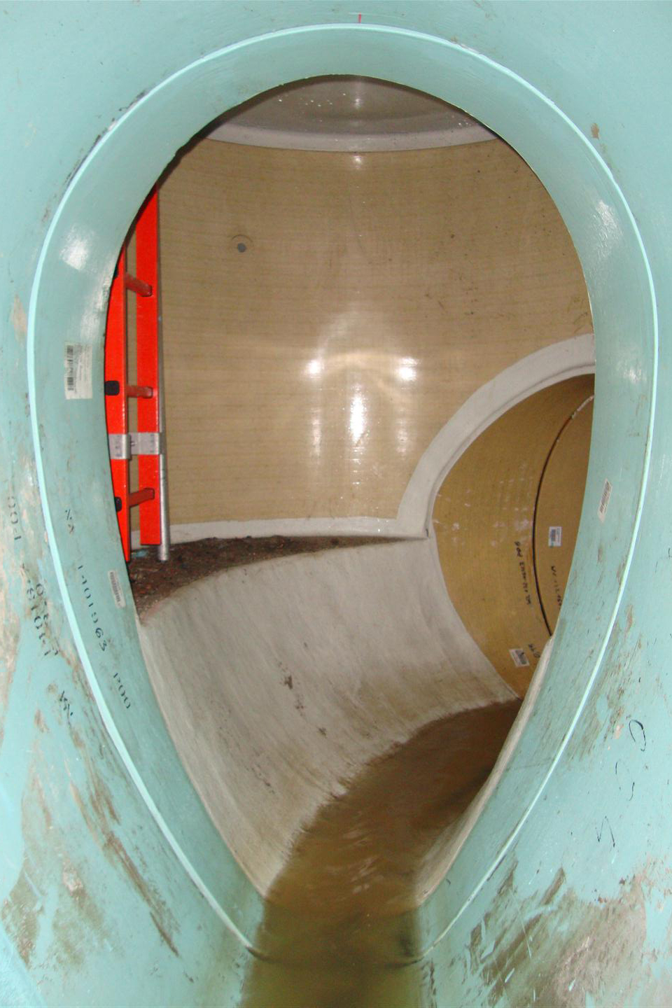 Natürlich kann der verwendete Werkstoff auch mit anderen guten Eigenschaften aufwarten. "Hierzu zählen nicht nur die Haltbarkeit und Widerstandsfähigkeit gegen Angriff durch biogene Säure, sondern auch hervorragende hydraulische Eigenschaften“, erläutert Thomas Schulz, Gebietsleiter Amiantit Germany GmbH, der gleichzeitig auch noch auf einen anderen wichtigen Aspekt hinweist, der bei der Sanierung des Mischwasser-Hauptsammlers in Wismar eine entscheidende Rolle spielte. Der sehr schlechte Altrohrzustand – vor Beginn der Sanierungsarbeiten war eine vorherige Stabilisierung notwendig – machte den Einbau eines selbstragenden Systems erforderlich. Eigenschaften, die die Eiprofile von Amiantit erfüllen: "Die statische Auslegung des GFK-Sonderprofils widersteht sämtlichen Lasten, wie Erd- und Verkehrslasten, sowie den Lasten durch Wasserdruck von außen und innen", so Schulz.