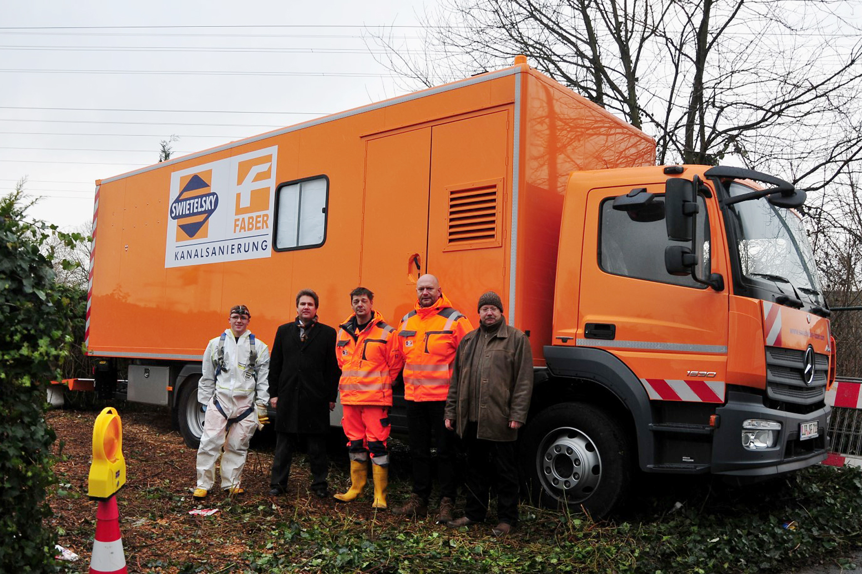 Dr. Ekkehard zur Mühlen, Geschäftsführer der HDT Hochdruck-Dosier-Technik GmbH, Bottrop, und Peter Markolwitz, ebenfalls HDT, übergaben im Februar 2015 die Schlüssel des LKW für die mobile automatisierte Kanal- und Schachtsanierung an ein Swietelsky Faber-Team. Die Swietelsky Faber GmbH, Niederlassung Blomberg, hat den LKW, eine Spezialanfertigung der HDT, im vergangenen Jahr in Auftrag gegeben und konnte ihn auf einer Baustelle in Köln-Porz erstmalig einsetzen.