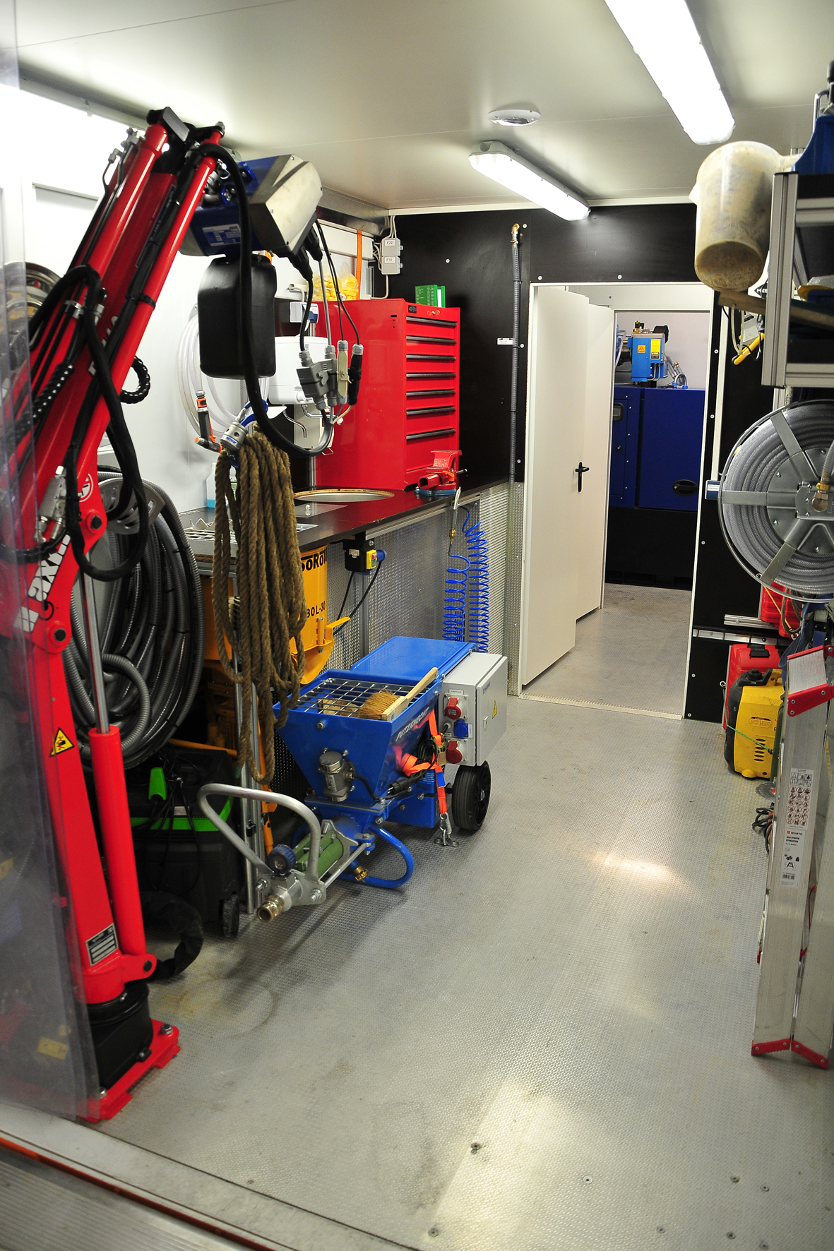Der LKW ist weitestgehend unabhängig und autark mit großem Wassertank und eigener Stromversorgung ausgerüstet. Er bietet daher den Vorteil, über mehrere Tage hinweg auf einer Baustelle operieren zu können. Er verfügt darüber hinaus über einen Maschinenraum mit einem Hochdruckwasserstrahlgerät und Kompressor sowie einen Mörtelmischbereich mit Tellermischer und Mörtelpumpe. Der eingebaute hydraulische Kranausleger (bis 3,7 Meter) ermöglicht eine einfache und sehr genaue Handhabung sowie maximale Flexibilität. Außerdem besitzt der LKW einen Sozialraum mit Sitzplätzen für vier Personen, eine Miniküche, eine Standheizung für den Kofferaufbau sowie eine Stellfläche für bis zu 2 t Material.