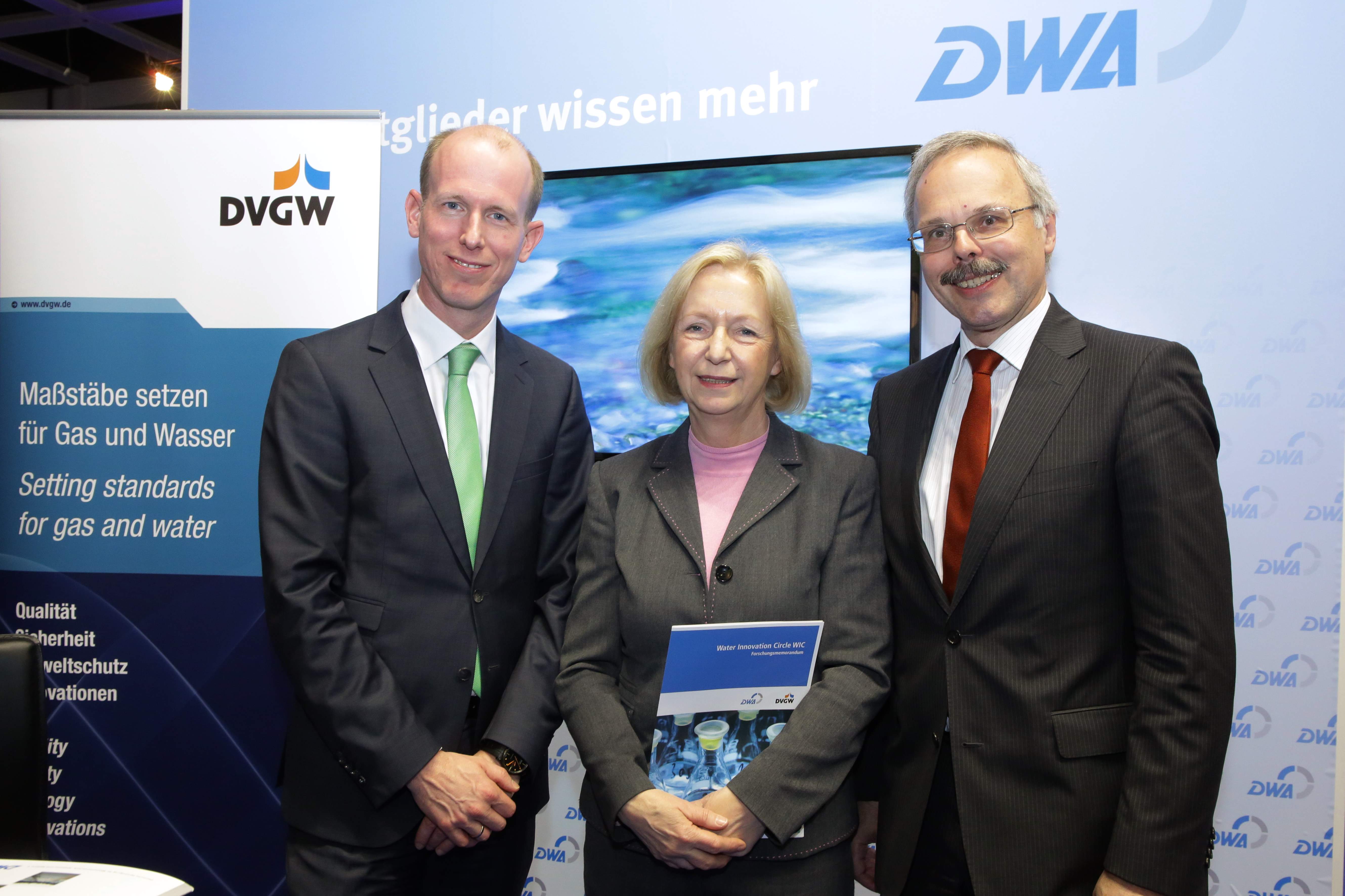 Der Präsident der Deutschen Vereinigung für Wasserwirtschaft, Abwasser und Abfall (DWA) und der Vizepräsident Wasser des Deutschen Vereins des Gas- und Wasserfaches (DVGW), Otto Schaaf und Dr. Dirk Waider, haben im Rahmen der Fachmesse "Wasser Berlin International" ein gemeinsames Forschungsmemorandum an Bundesforschungsministerin Prof. Dr. Johanna Wanka übergeben. In seinen drei Themenfeldern "Stoffe", "Systeme" und "Technologien" orientiert es sich an den fachlichen Herausforderungen von DWA und DVGW und zeigt den notwendigen Forschungsbedarf aus Sicht der wasserwirtschaftlichen Praxis auf.