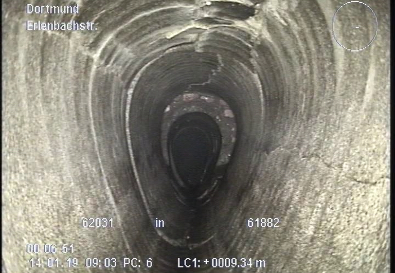 Insgesamt fünf Haltungen sowie sechs Schächte umfasst der im Jahr 1951 erbaute Kanalstrang im Bereich der Erlenbachstraße im Dortmunder Stadtbezirk Aplerbeck. Auf rund 100 Metern wurden seinerzeit Betonrohre mit einem Ei-Querschnitt von 400/600 Millimetern verbaut.