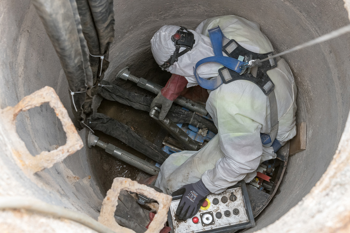 Im Zielschacht wird der Messerkopf und die Aufweithülse an das Berstgestänge montiert. Hinter der Aufweithülse werden die neuen Rohre – zum Einsatz kamen in Beverstedt Kurzrohre aus Polypropylen (PP) – zugkraftschlüssig verspannt. Diese Verspannung wird für den Einbau jedes neuen Kurzrohres gelöst und anschließend wieder angezogen.