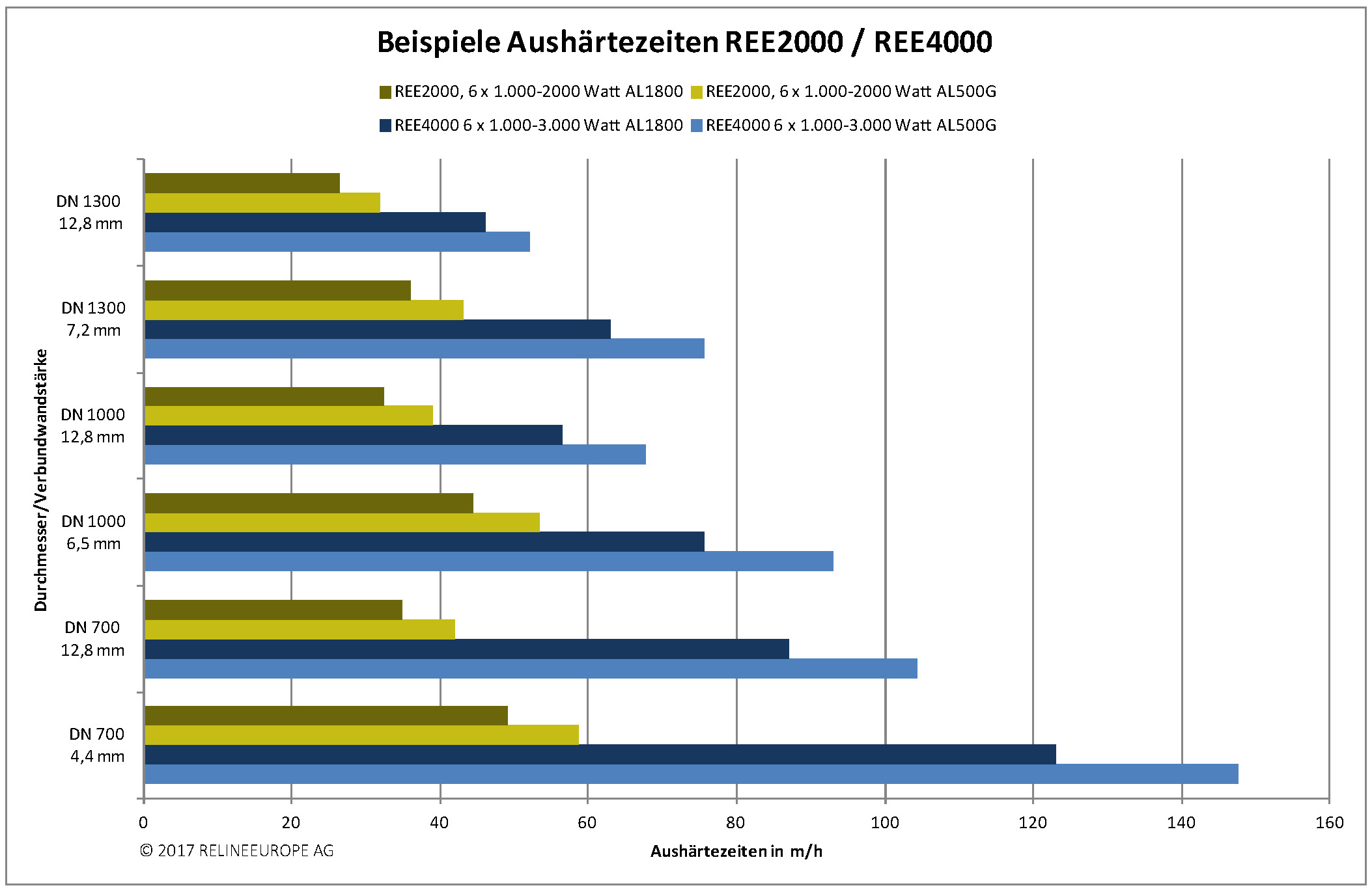 Die Geschwindigkeitsvorteile dieser Technologie verdeutlicht folgendes Beispiel: Mit der REE4000 und der UV‐Kette mit 6 x 3000 Watt wird ein GFK Schlauchliner Alphaliner500G der Dimension DN 700 und einer Wandstärke von 4,4 mm mit einer Geschwindigkeit von 2,46 Metern/Minute und damit einer Stundenleistung von fast 150 Metern ausgehärtet. Im Vergleich zur Aushärtung mit der bewährten REE2000 mit 6 x 2000 Watt Leistung bedeutet dies eine Steigerung der Aushärtegeschwindigkeit um ca. 150 Prozent.