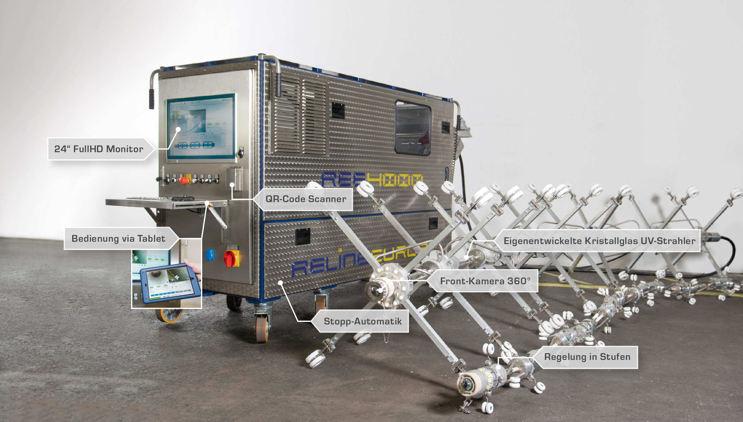 Die neu entwickelte REE4000 ist mit einer maximalen Strahlerleistung von 24.000 Watt (6 x 4.000 Watt) die derzeit leistungsstärkste UV‐Aushärteanlage auf dem Markt und bietet viele innovative Features für die sichere und wirtschaftliche Sanierungsausführung insbesondere von sehr großen Durchmessern.