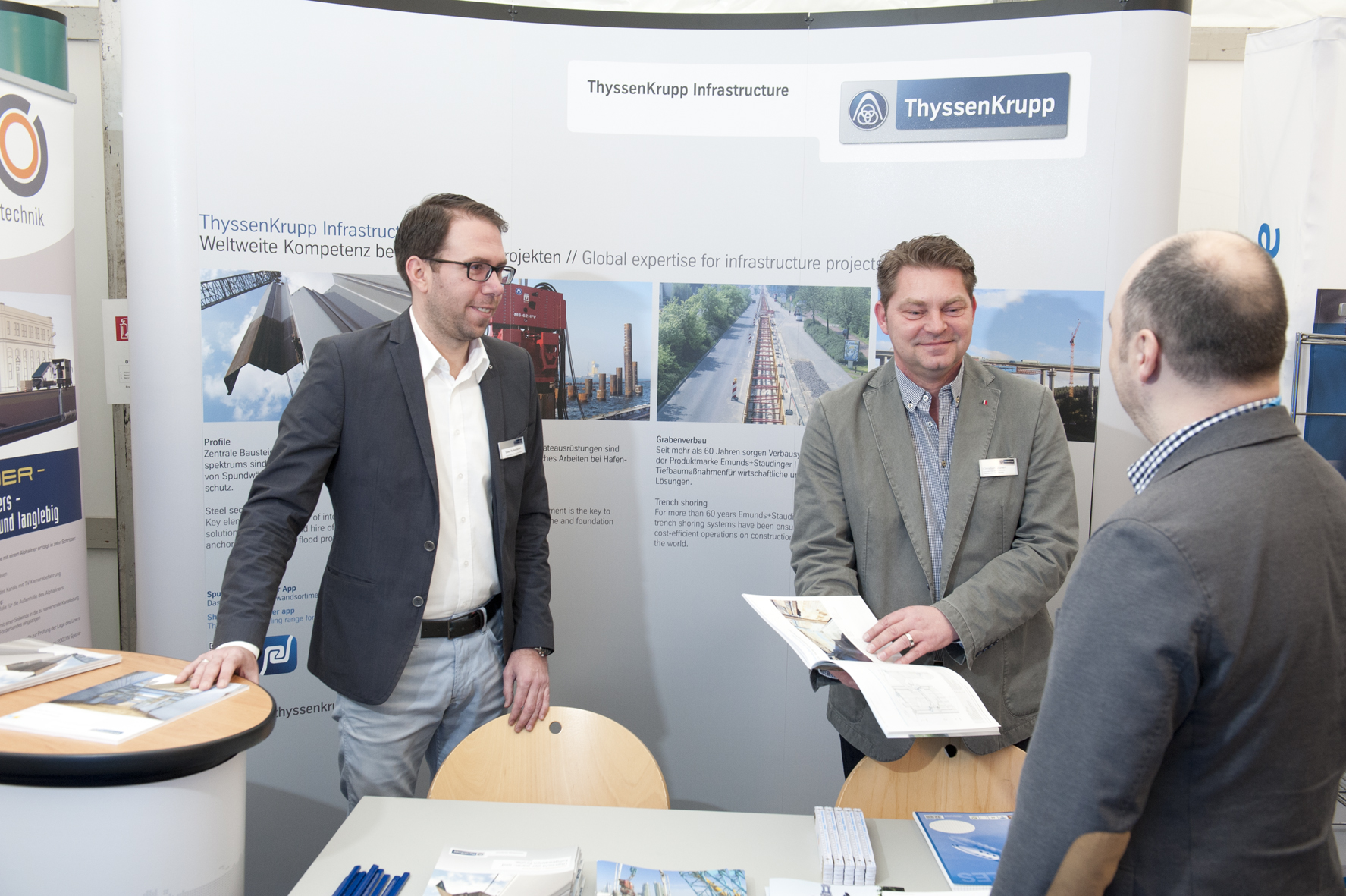 „Sehr zufrieden mit der Resonanz auf den Auftritt“ zeigen sich Sven Rademächers, Export Manager thyssenkrupp Infrastructure, und Christian Grunert, thyssenkrupp Infrastructure Vertrieb, Sparte Grabenbau. Unter den mehr als 3500 Fachbesuchern auf dem Oldenburger Rohrleitungsforum seien auch diesmal wieder zahlreiche Gäste aus dem Ausland gewesen, die sich für Sicherheit und Qualität „Made in Germany“ interessiert hätten. Zu der umfangreichen Palette von Produkten für die Sicherung von Gräben und Baugruben zählt neben dem Gleitschienenverbau, Verbauboxen und Dielenkammerverbau, Zubehör wie das Baustraßensystem, Rohrgreifer und Rohrzugmaschinen.