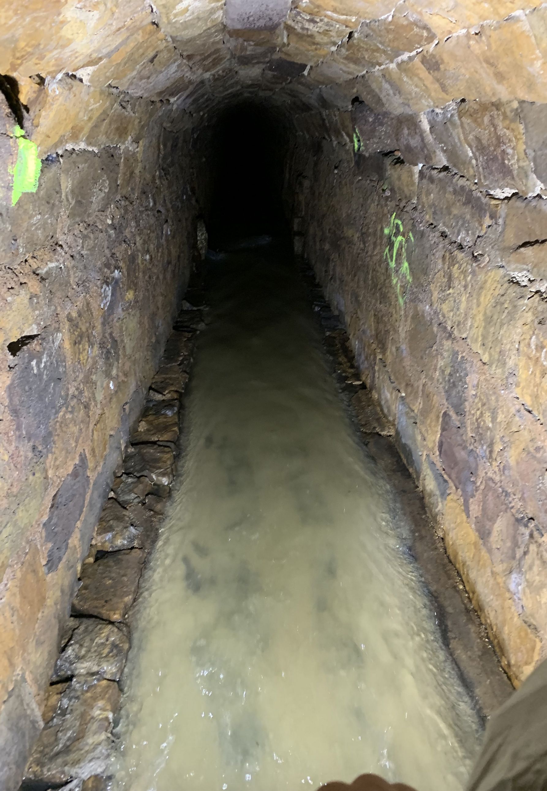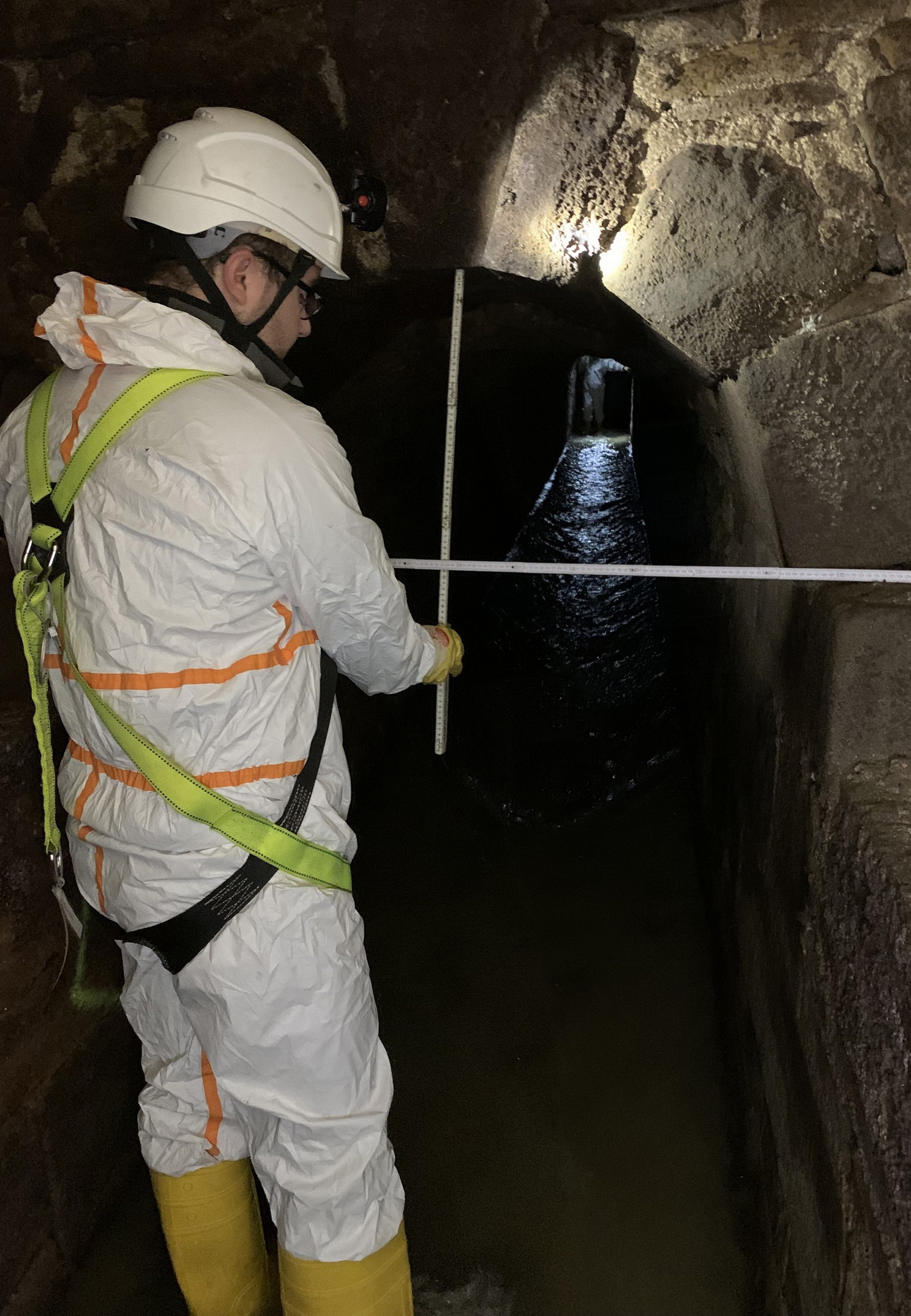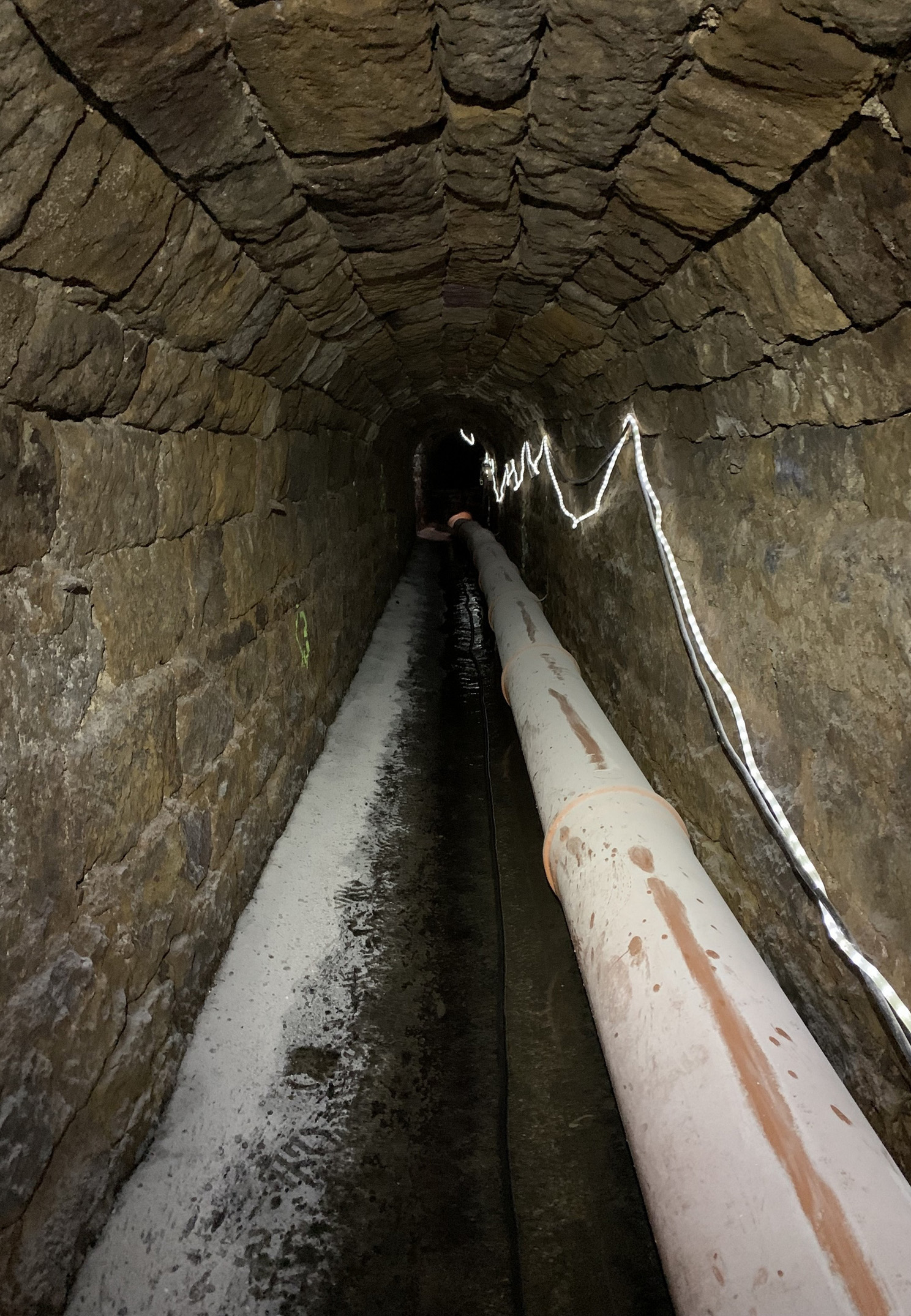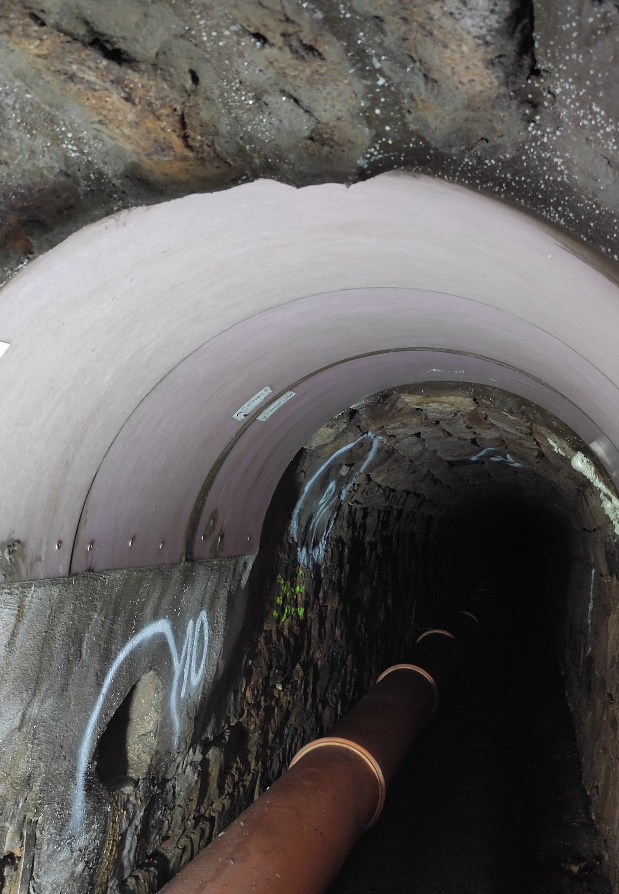 Eine TV-Inspektion inklusive 3D-Bestandsvermessung sowie eine Begehung des Kanals im Rahmen der erweiterten Zustandserfassung dienten als Grundlage für die Planung der umfangreichen Sanierungsmaßnahme. Statische Nachberechnungen zur Resttragfähigkeit der Altrohre ergaben einen guten Zustand. Davon ausgenommen war ein Gewölbe mit einem ebenfalls verdeckten Schacht. Diesen galt es aufzugeben und zu verfüllen. Das Hauptschadensbild im Rohr selbst stellten die ausgewaschenen Fugen mit Hohlräumen innerhalb des Kanalabschnittes dar – vor allem im Wandfußpunkt und den Seitenzuläufen. Als Ursache hierfür wurde – neben strukturellen Schäden – auch die sehr hohe Fließgeschwindigkeit des Mischwassers in diesem Bereich identifiziert.
