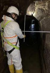 Das Einbringen der GFK-Halbschalen in den Kanal erfolgte elementweise über die vorhandenen Zustiege. Im Einbaubereich der Schalen wurden die Wände zuvor mit hochsulfatbeständigen, mineralischen Mörteln reprofiliert, um eine geeignete Auflagerfläche für die GFK-Profile zu schaffen. Anschließend wurden die GFK-Halbschalen über Kopf auf die vorbereitete Kanalwandung aufgesetzt und angedübelt. Die Verbindung der einzelnen Halbschalen erfolgte durch die mechanische Verzahnung der GFK-Bauteile sowie durch ein zusätzliches Laminieren mit vor Ort härtendem Handlaminat. Auf diese Weise können selbst Bögen und Sonderformen saniert werden.