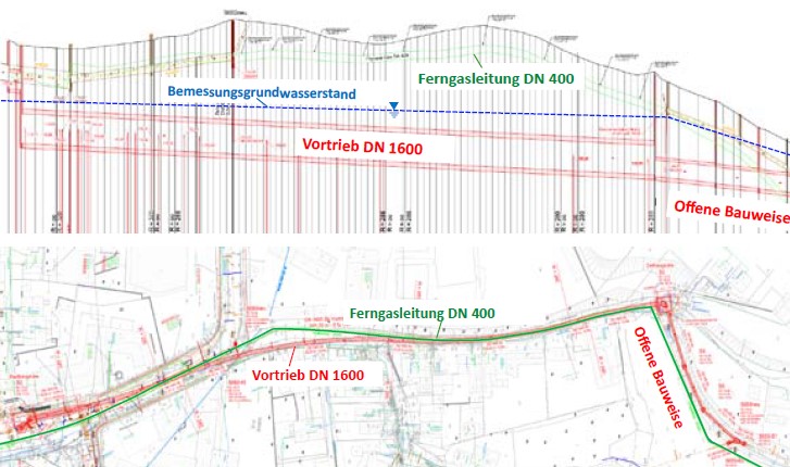 Die Trasse beginnt in einem stark befahrenen Kreuzungsbereich mit sehr beengten Platzverhältnissen und endet in einem Landschaftsschutzgebiet, in dem besondere Umweltauflagen zu beachten sind. Es ist bereichsweise mit einem hohen Grundwasserstand zu rechnen. Eine Ferngasleitung DN 400 verläuft über weite Strecken direkt oberhalb der Vortriebstrasse.