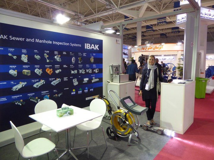 Babette Ney, IBAK-Vertriebsmitarbeiterin, führte dem interessierten Publikum die ARGUS-Kamera und die MiniLite vor, da die Inspektion von Hausanschlüssen auch im Iran ein sehr wichtiges Thema ist. Unterstützung bekam Babette Ney vom IBAK-Partner ATICER, die mit einem eigenen Außenstand auf der Messe vertreten waren und zusätzlich auf dem IBAK-Stand als Ansprechpartner fungierten.