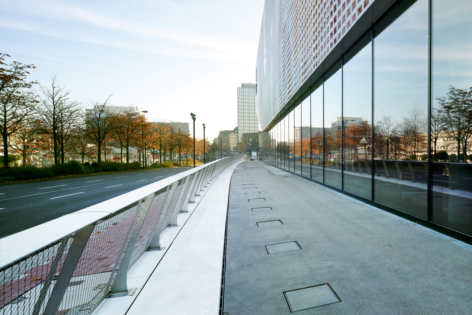 Für diesen Bereich waren von Anfang an Schlitzrinnen vorgesehen, die sich, unterirdisch verlaufend, dem visuellen Gesamteindruck unterordnen. An der Oberfläche sind sie nur als schmale Schlitze sichtbar. Zugleich machte das innerstädtische, dicht bebaute Einsatzgebiet eine hohe hydraulische Leistung notwendig. Die Planer entschieden sich für Faserfix Standard 150 mit Schlitzabdeckungen von Hauraton. Für die Fassadenentwässerung wurden zusätzlich Faserfix KS Rinnen mit hohen Rinnenausführungen und engmaschigen Gitterrost-Abdeckungen gewählt.
