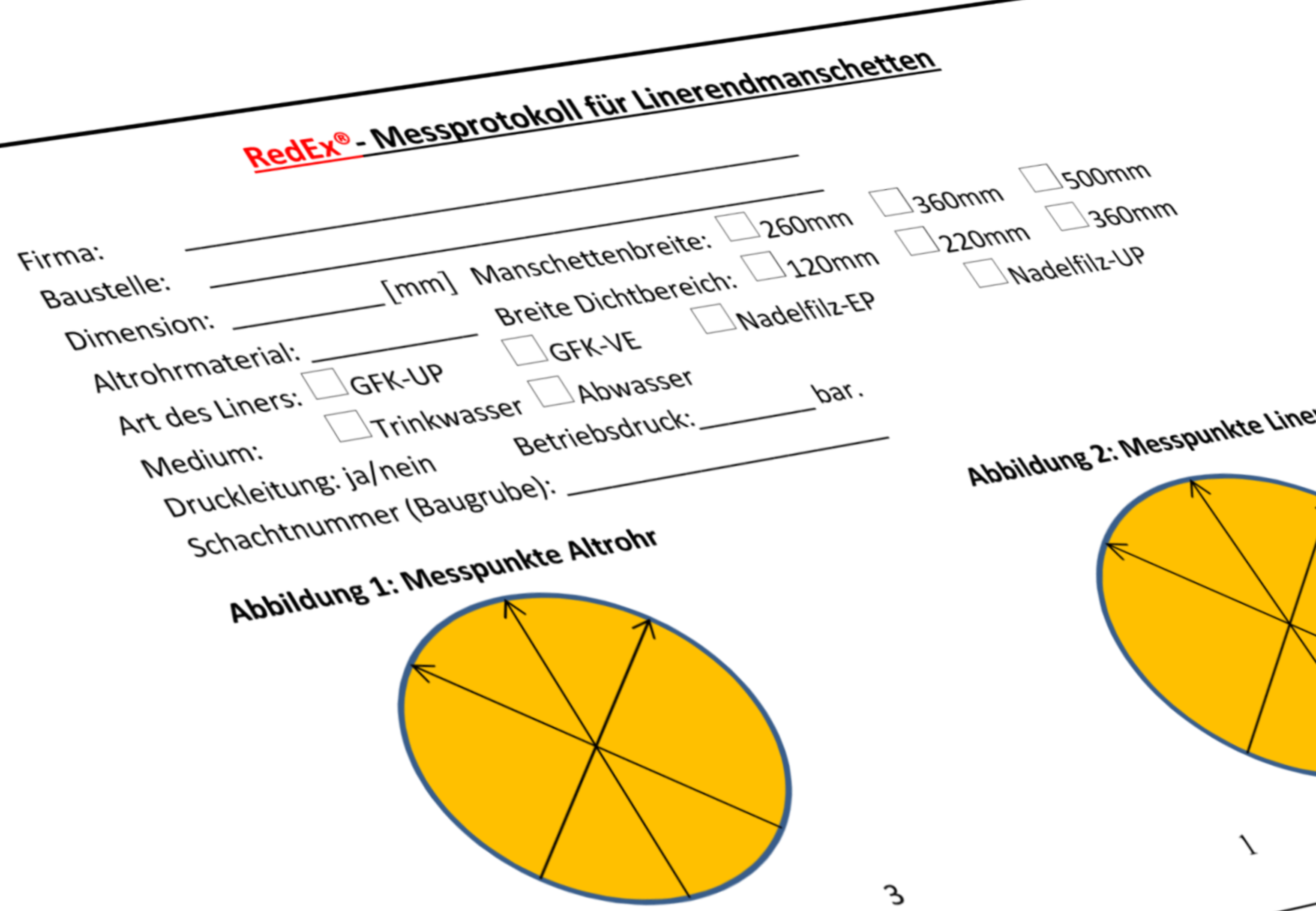 In den Einbauprotokollen werden darüber hinaus die verschiedenen Einbauparameter verglichen und protokolliert. In das RedEx-Messprotokoll für Linerendmanschetten (LEM) können Anwender die verschiedenen Messpunkte an Altrohr und Liner eintragen. Nur so ist eine millimetergenaue Konfektionierung der Dichtmanschetten möglich. Je genauer die Messung, desto einfacher ist die Installation für eine nachhaltige Dichtheit.