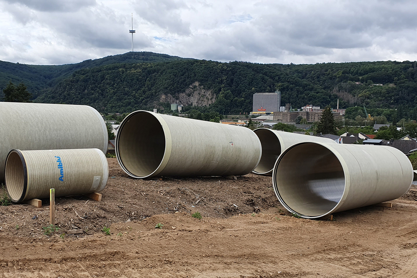 Der Vorschlag von Deisen, stattdessen deutlich leichtere GFK-Rohre von Amiblu zu verlegen, überzeugte nach eingehender Prüfung sowohl den Erschließungsträger, der gleichzeitig auch Planer und Bauherr war, als auch die Stadt Lahnstein als spätere Eigentümerin. Dabei wurde zunächst sowohl die Kostenneutralität bei der Errichtung als auch die technische Gleichwertigkeit der GFK-Rohre gegenüber einem Betonkanal geprüft. Deisen hatte mit der Rohrverlegung aus diesem Werkstoff in der Vergangenheit bereits gute Erfahrungen gesammelt – wenn auch „nur“ bis zu einem Durchmesser von DN 1200.