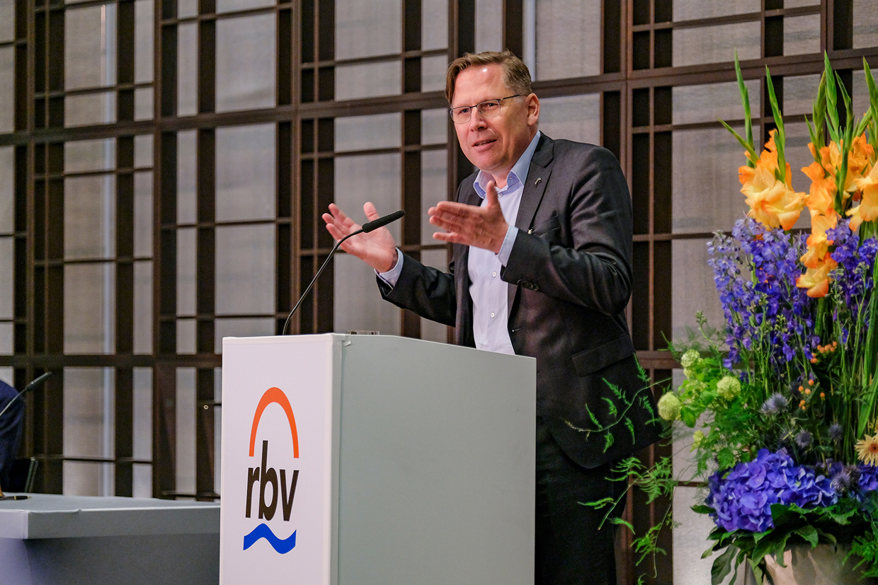 „Wenn ich eines in der Zusammenarbeit mit dem rbv gelernt habe, dann, dass das Zusammenwirken zweier Kräfte viel mehr ist als die Summe der einzelnen Teile“, so der DVGW-Vorstandsvorsitzende Prof. Dr. Gerald Linke in seinem Grußwort an Lang. Die Kooperation sei stets von gemeinsamen Visionen geprägt gewesen, betonte Linke und bedankte sich für die besondere Wertschätzung, die dem DVGW mit der Einladung zu einer Laudatio entgegengebracht werde. „Transformationsprozesse haben uns in den letzten Jahren unseres Zusammenwirkens in besonderer Weise beschäftigt“, betonte Linke. Hierbei handele es sich um Transformationen in Richtung einer ökologischen Energiewirtschaft oder einer krisenfesten Wasserwirtschaft, die dazu in der Lage sei, auch für die Auswirkungen des Klimawandels Anpassungsstrategien zu finden.