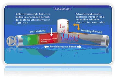 Veranlassung: "In wasserführenden Systemen kommt es immer wieder durch Schwefelwasserstoff zur Geruchsbelästigung. Schwefelwasserstoffgas riecht nach faulen Eiern, wird bereits in kleinsten Mengen vom Menschen wahrgenommen und beeinträchtigt unsere Lebensqualität oder die Sicherheit am Arbeitsplatz. Überall wo in Behältern und Rohren Wasser vorhanden ist, bilden sich nach einiger Zeit Schleimbeläge, die man auch als Biofilme bezeichnet. In den Biofilmen nisten sulfatreduzierende Bakterien, die für die Bildung von Schwefelwasserstoff verantwortlich sind. Probleme mit üblen Gerüchen oder Korrosion treten im kommunalen und industriellen Abwasser meist in Verbindung mit Druckrohrleitungen auf, da diese erst an ihrem Ende Kontakt mit der Atmosphäre haben und somit anaerobe Bedingungen in der Leitung begünstigen. Aber auch Freispiegelleitungen oder Wassersysteme mit hohen Sulfatgehalten können für die Entstehung von übel riechendem Schwefelwasserstoff verantwortlich sein. Meist lässt das Folgeproblem Korrosion dann auch nicht lange auf sich warten. Wie in der Grafik erkennbar, kommt es nach dem Verbrauch von Sauerstoff zunächst zur Denitrifikation und im Anschluss daran zur Sulfatreduktion, die das unerwünschte Schwefelwasserstoffgas (H2S) bildet." [www.sachtleben-wasserchemie.de Dr. Arne Hörsken]