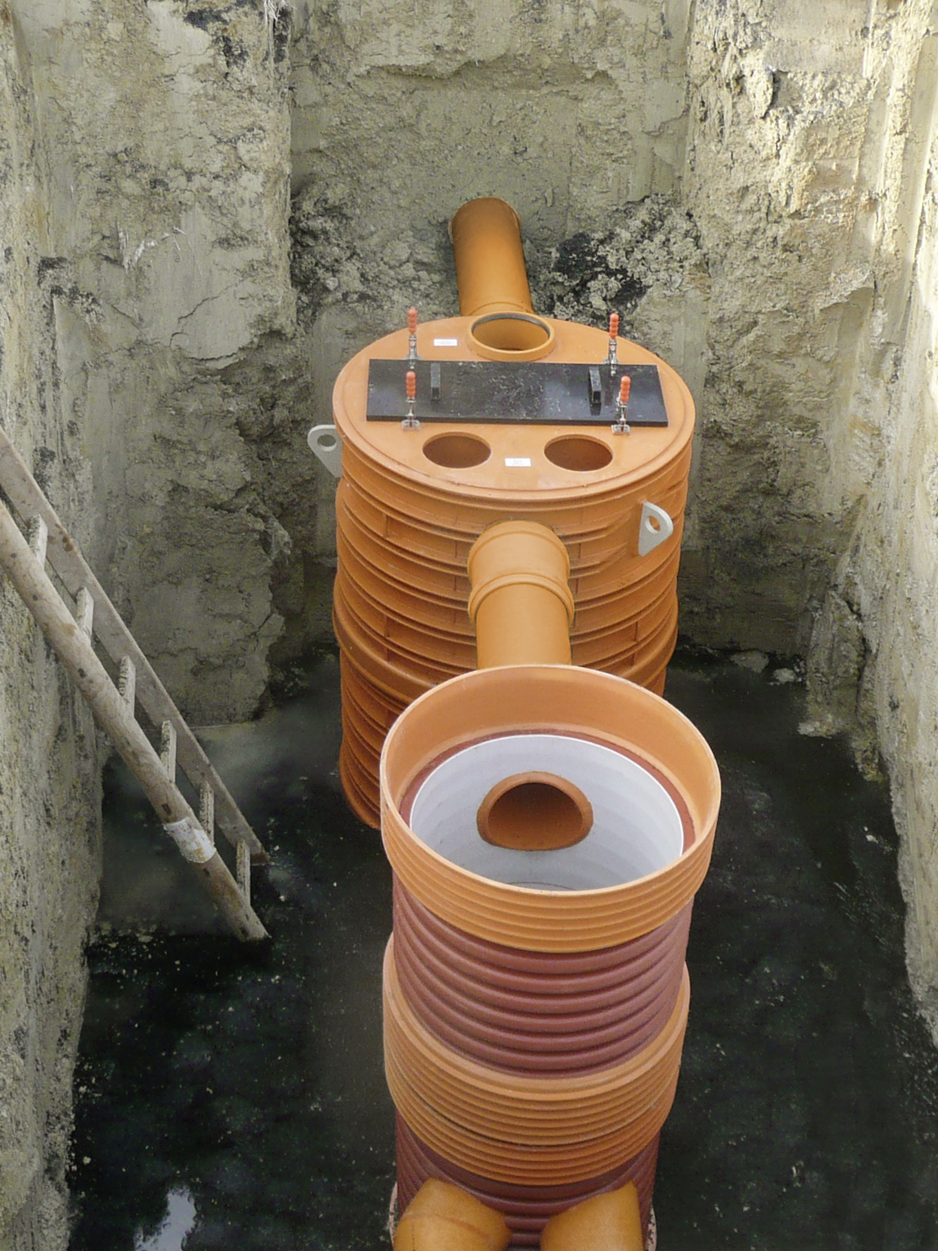 Das vom Planungsbüro erarbeitete Entwässerungskonzept sieht vor, dass nur das unbelastete Dachflächenwasser des Gebäudes über ein offenes Retentionsbecken gedrosselt in einen nahegelegenen Bach geleitet wird. Wegen der eingeschränkten Flächenverfügbarkeit und der zulässigen Belastbarkeit des Gewässers wird das von den Park- und Verkehrsflächen ablaufende Wasser zunächst über eine modular aufgebaute Niederschlagswasserbehandlungsanlage geführt, die aus einer Sedimentationseinheit zur Abscheidung von Partikeln und Leichtflüssigkeiten und einem Adsorptions- und Filterschacht zur Reinigung der gelösten Schadstoffe besteht.
