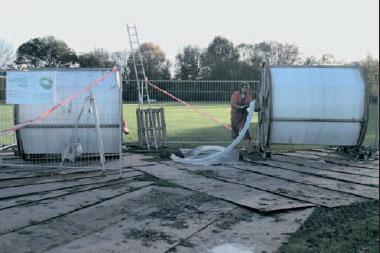 The two concealed manholes first had to be localised electronically. One of them was situated at the edge of the football field and had to be exposed, to allow access to the pipe. For this operation, the excavator was placed on sheets of plastic to protect the grass. Thus the preparation of this section was somewhat more time-consuming than in “normal conditions”.