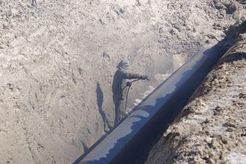 The corrosion of the bare metal is rapidly accelerated by the highly standing, saline groundwater. Thus, countless leakages occur in the pipeline; the oil flows out constantly.
