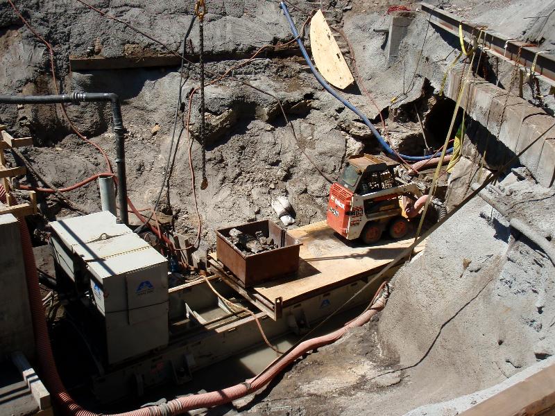 Using jackhammers and a skid loader with a modified bucket for spoil removal, PCi Roads is running two shifts per day. As crew members excavate enough to accommodate the full length of a pipe segment, an Akkerman 5000 Series Pump Unit, skid and yoke direct jack the RCP into the tunnel. While this production may seem slow in comparison to a typical TBM set-up, it is the most cost effective approach to the project. Construction is hindered if a mere ¼ inch of rain befalls the city and it's been a really rainy season so far. Despite this, crew members are making good progress.