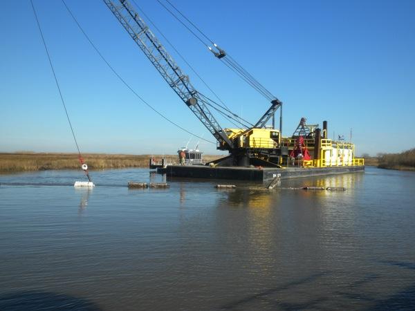Serving as project manager for Chevron, Ralph Radomski oversaw the drilling, pipe stringing and marine operations conducted by the team of contractors. To support Michels’ drilling operations, Chevron hired a local contractor, Sunland, who are familiar with directional drilling procedures and have extensive experience in local marine construction. Sunland performed pipe string-out and welding operations for both crossings, and also provided marine support for the HDD operations. This included barging Michels’ resources to the exit sides and excavating a temporary false ditch for floating the pipe through a marsh area before finding suitable water to float the remaining section.