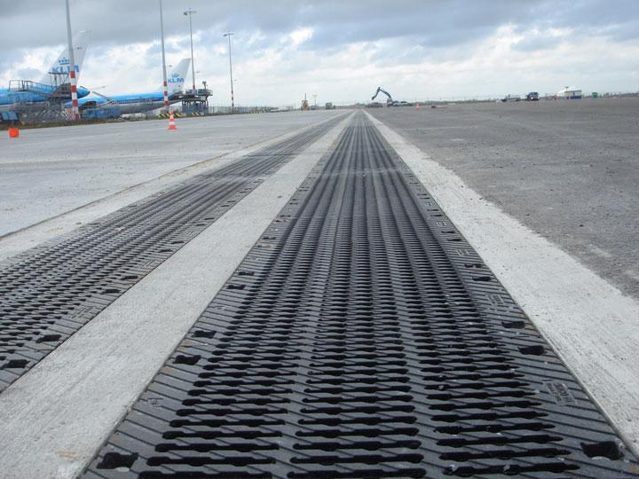 To guarantee safe air traffic operations, the rainwater accumulated must be quickly, directly, and completely collected and drained off. To do this, channels must be installed on the surface whose gratings need to meet the architectural demands as well as provide the stability necessary for heavy loads. For Schiphol, load class F 900 was necessary for installation lengths of 2 m and nominal widths of up to DN 500.