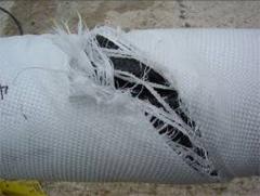 Preliminary testing was conducted on 9 inch outer diameter liners (as designed for a 10inch steel line) constructed with a balanced weave of high performance polyethylene (HPPE) fibers with various different helical wrap angles. Carbon tapes were not included in these test articles. The burst pressure predicted for a specimen with a 54.7 degree wrap angle was 967 psi (66 bars). Figure 4 shows the failure mode that occurred at the actual burst pressure of 1175 psi (80 bar).