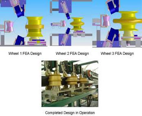 Having helped to establish the feasibility of the deformation process, by providing material strains and required forces, the FEA was further used to help design the C-former machinery. This equipment is shown in Figure 7. Note that the deformed liner shapes that are shown at the wheels in this apparatus are from the FEA results.