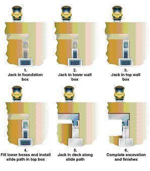 This concept in its basic form is to at the first stage install man entry jacked foundation boxes or tunnels which are fabricated with removable lids. These foundation units are designed to ultimately carry the permanent dead and live loading. Once installed a suitable slide track is installed in the boxes to very close accuracy. Precast arch sections are dropped into place at the launch area and jacked in along the track with lids being removed within the shield as excavation takes place. A compartmentalized shield is fitted to the leading unit to control the face as excavation proceeds.