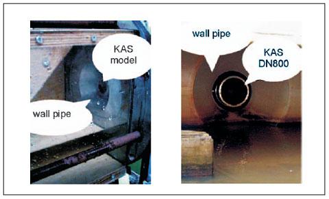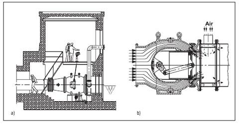 - Design with vaned ring => soft, widely open jet (Figure 7) (depending on the jetguiding pipe): large part of the energy will be converted within the outflow jet, thus protecting the stilling basin.