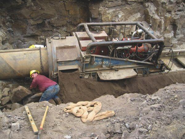 An excavator was also used when the excavator bucket was placed on the product casing in close proximity of the disc cutter to apply pressure and to aid in the stability of the cutter as the machine made the initial penetration of the rock wall. This practice is typical for most disc cutter head jobs because the critical nature of the cutters first contact with earthen embankment will create some vibration that if not supported or monitored could cause the line of the bore to be compromised. The excavator was withdrawn shortly after the entire disc cutter had disappeared into the formation, and the vibration ceased because the head and the product casing was now shrouded in the compact composition of the earth, and the operators of the bore had settled the machine into a ‘sweet spot’ that would allow them to steadily progress.