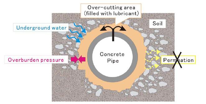 Moreover, during the pushing processes, the lubricant is injected into the face and the over-cutting area, which is between the concrete pipe and the soil. After the lubricant fills the voids, the soil stabilizes due to the lubricant pressure during the construction work. Figure 1 shows an illustration of the roles of a lubricant.